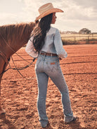 Riding has never felt or looked this good. Meet the Wrangler® Riding Jean Rodeo High Rise Boot, crafted for riders by riders. These jeans are crafted from a durable cotton blend that’s interwoven with Dyneema® fibers—15x tougher than steel yet light enough to float on water—for strength and lasting softness. They feature a high-rise silhouette with a contoured waistband for the perfect fit both in and out of the saddle. Fitted through the seat and thigh, they complement your curves and end in a classic bootcut leg opening that creates the perfect stack. You’ll also have the signature five-pocket styling and iconic details to keep your everyday look grounded in Western authenticity.