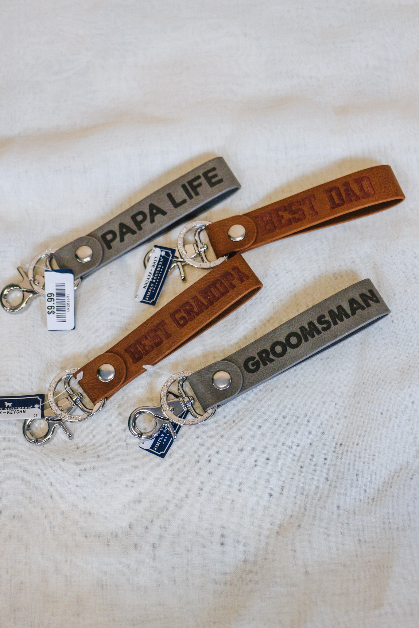 Personalize your keys with our PU leather keychains. Features silver hardware and fun designs.