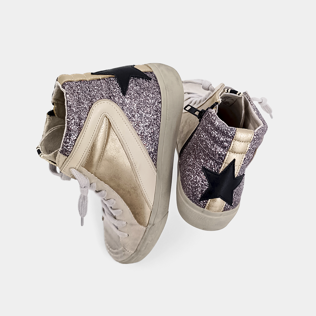 Nodding to vintage basketball sneakers, our ROONEY high-tops stand out for their unmistakable style and versatility. This pair is crafted from shimmering faux leather and glitter. Wear them with anything from skirts to track pants or tailoring.