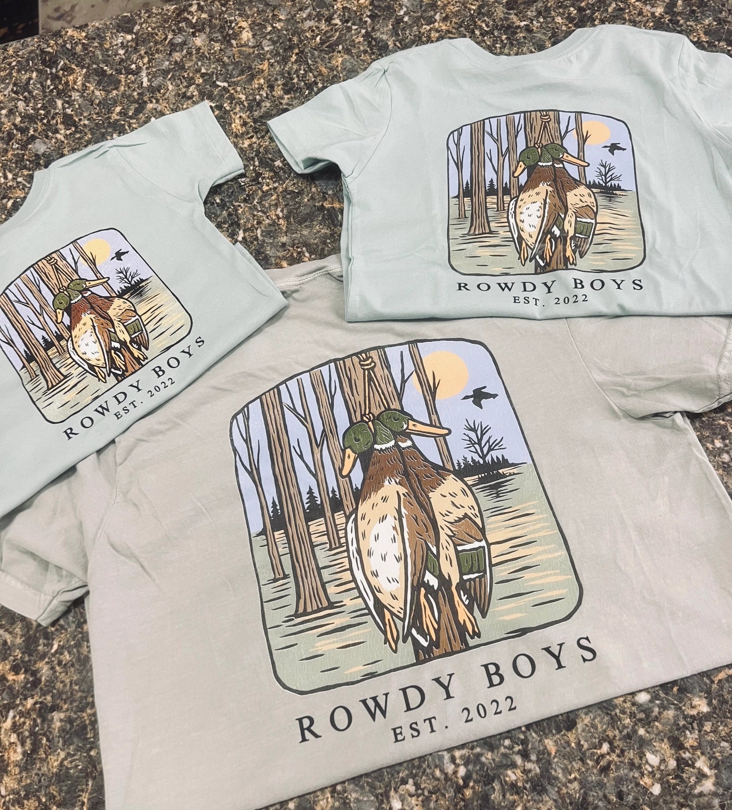 Our Mallard Hunting Youth Tee from Rowdy Boys is a short-sleeved shirt in a Bella + Canvas Dusty Blue color. Designed with input from one of our own rowdy boys, this tee is not only visually appealing but also prioritizes comfort. Perfect for our young Southern Gents, this shirt embodies the spirit of Rowdy Boys.