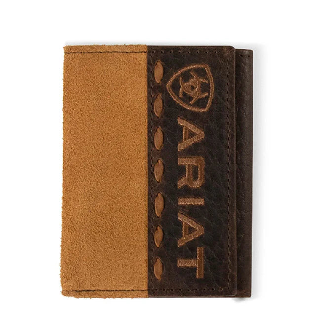 This Ariat trifold wallet by M&F Western Products is genuine leather. Classic roughout body with a chocolate rowdy leather overlay and buck lace stitching. Embroidered Ariat logo and name. Cash and card slots, and ID window on the inside.