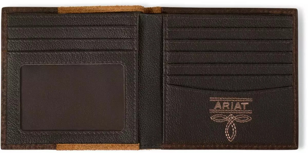 This Ariat large bifold wallet by M&F Western Products is genuine leather. Classic roughout body with a chocolate rowdy leather overlay and buck lace stitching. Embroidered Ariat logo and name. Cash and card slots, and ID window on the inside.