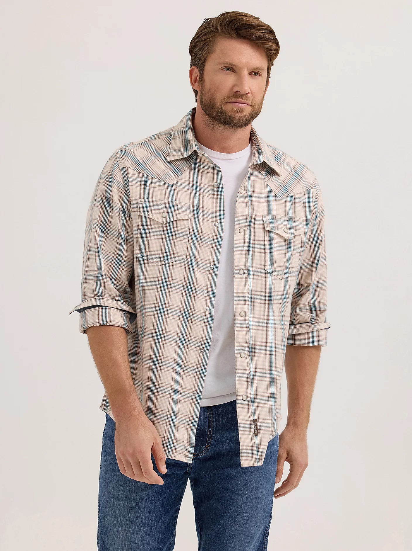 Our men's Wrangler Retro® Premium long-sleeve western snap plaid shirt delivers all the authentic western styling you love but with a modern fit that's perfect for the contemporary cowboy. It's crafted from cotton for all-day comfort and long-lasting durability. Plus, it features pointed front and back yokes, contrast trim, snap cuffs, and a full snap closure. You can easily wear this long-sleeve snap shirt all year long, and it looks great layered over a white t-shirt. Complete the look with your favorite pair of Wrangler Retro bootcut or slim-fit jeans.