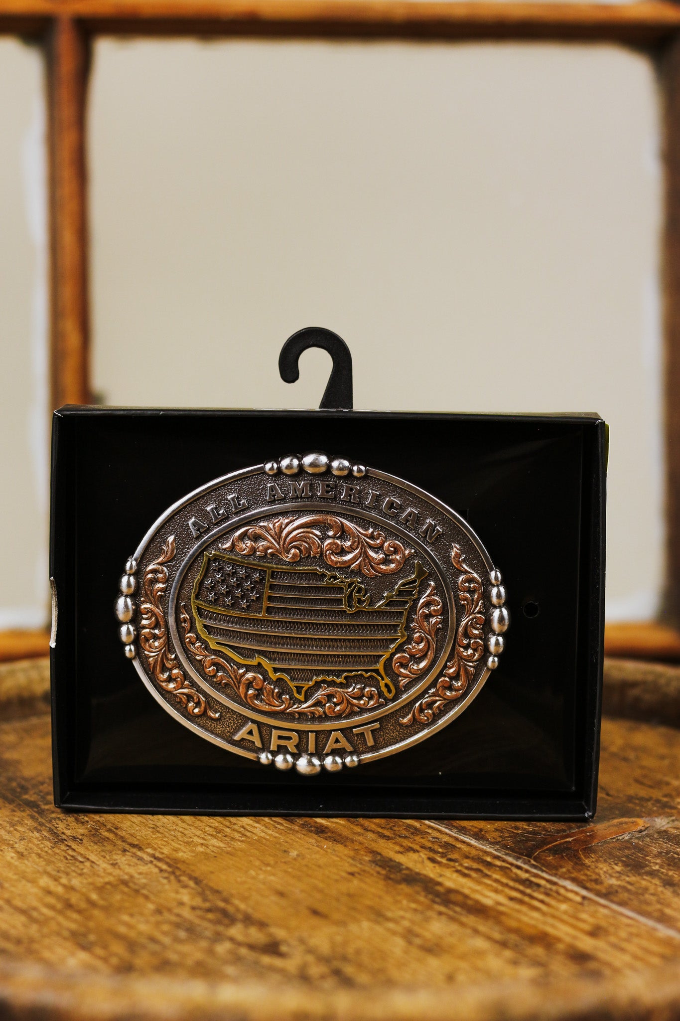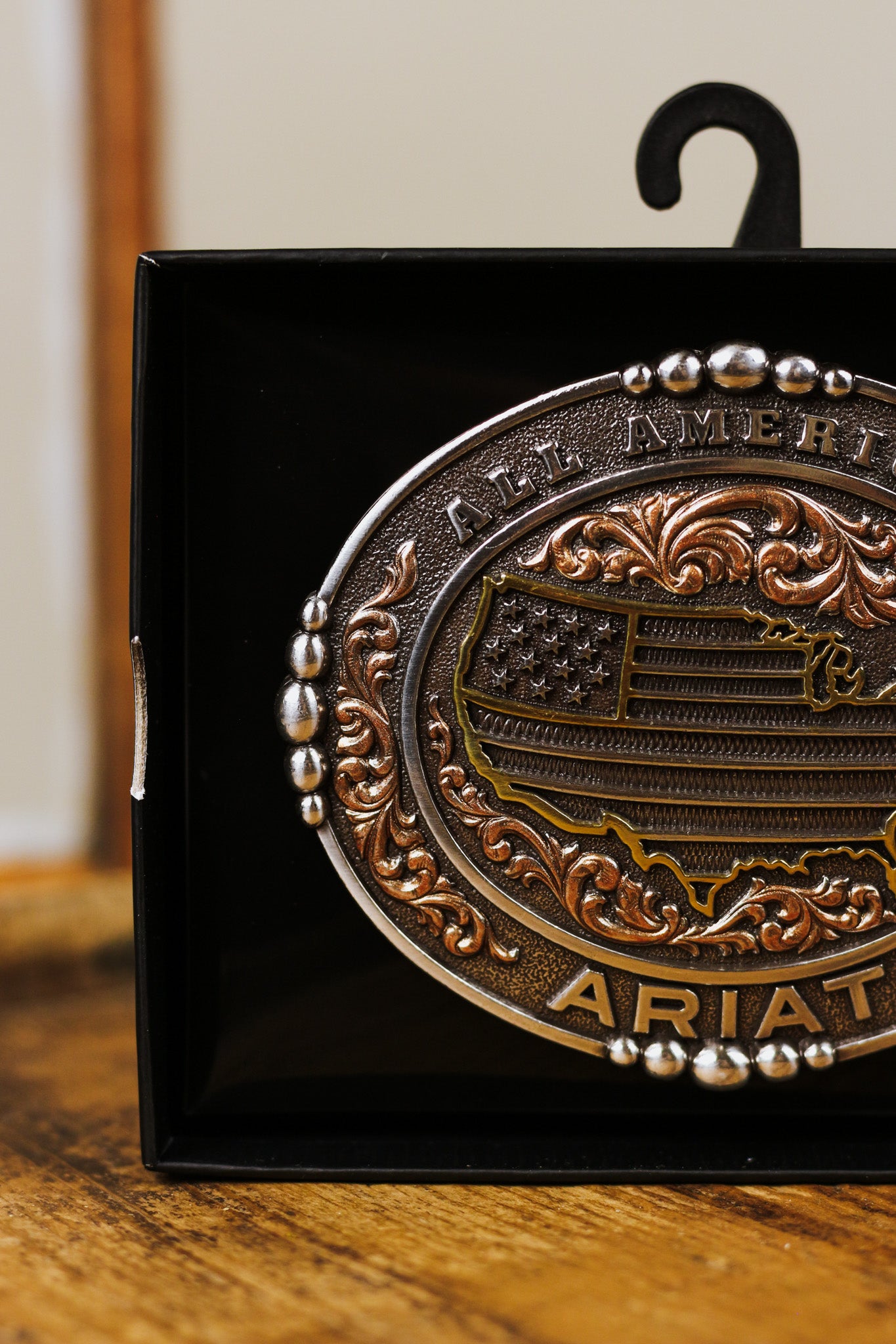 Unique Ariat "All American" Belt Buckle. Great Ariat buckle by M&F Western Products. Oval buckle with four beaded accents on the edge. “All American Ariat” is engraved on the top and bottom of the buckle. There are copper floral engravings on the buckle that accent the engraved outline of the United States and flag design. Floral engraving on the back. Antique silver and copper finish.