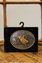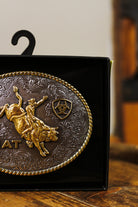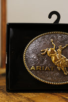 This 4 x 3 buckle showcases an antique silver and gold finish and is adorned with a rope edge and a floral engraved background. The focal point of the buckle is a bull rider motif in antique gold, surrounded by the raised Ariat name and logo in the same color.