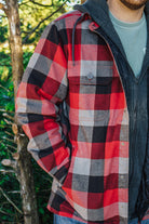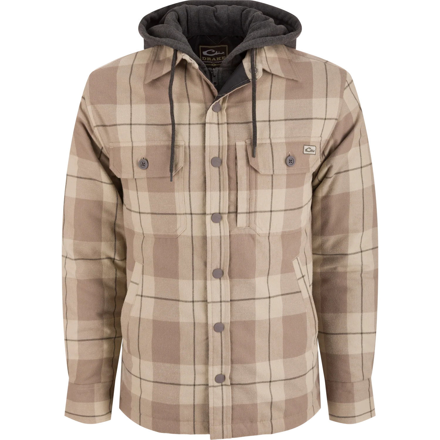 The Drake Men’s Campfire Flannel Jac Shirt Hoodie is built to keep you warm and comfortable on an Autumn afternoon. The Jac is made from a cotton and recycled polyester blend and features an adjustable drawstring hood, a button snap closure, interior quilted insulation, and adjustable cuffs. The Jac gets its inspiration from work wear and can be worn as a shirt or as a mid-layer when extra warmth is needed. At the game or the job site, the Drake Campfire Flannel Jac Shirt Hoodie will keep you comfortably warm with style.