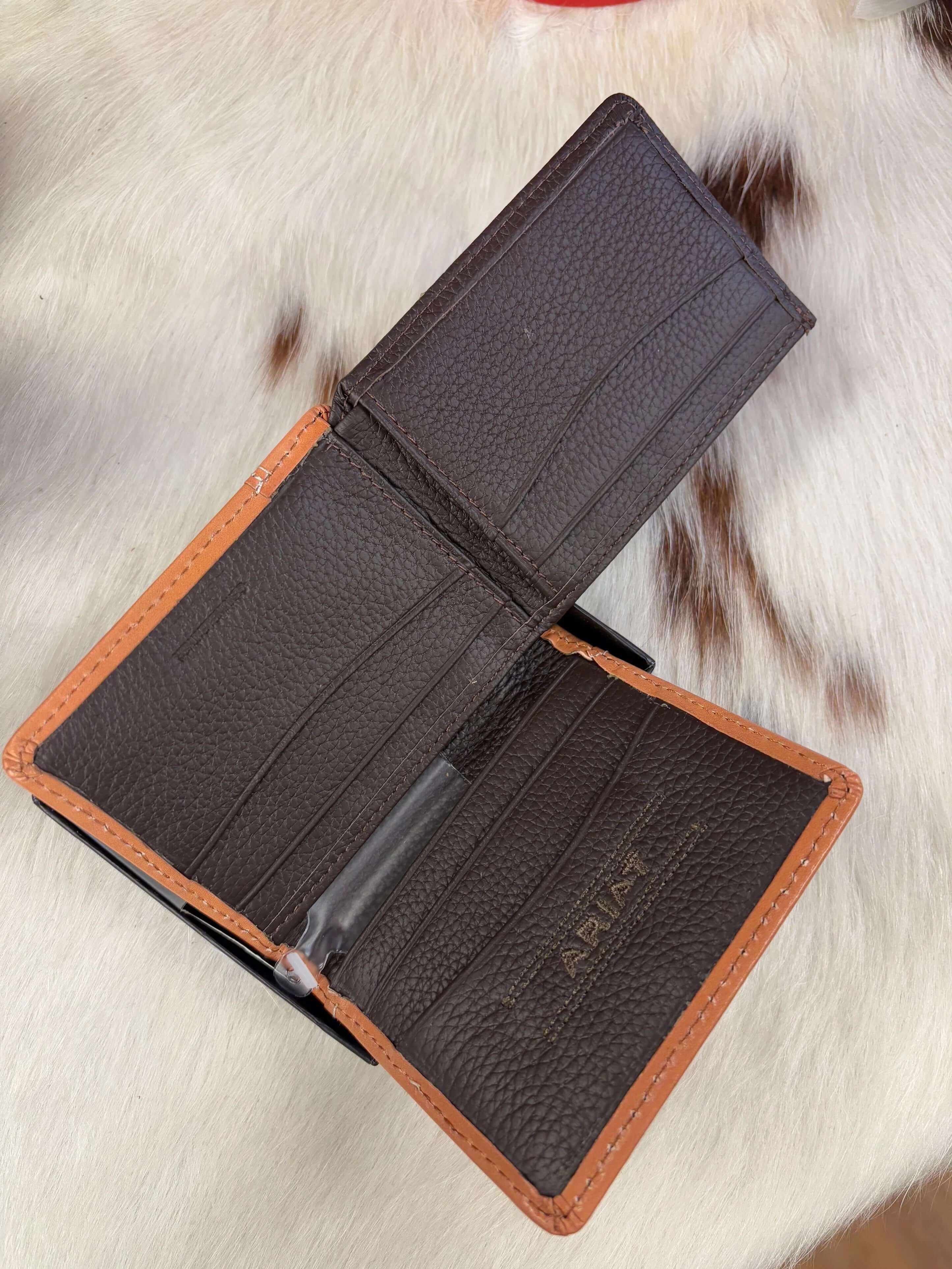 Accessorize in style with this men’s bifold wallet from Ariat by M&F Western. This leather wallet has embossed basket weave overlay with light calf hair on the front and an Ariat shield concho in antique silver. It has multiple card and cash slots with an ID window on the inside. Please note hair on hide is a natural product and will wear under normal conditions. Each product may vary slightly in shading, hair length and color making each item a unique product. This product comes in assorted colors only and specific color requests cannot be accommodated.