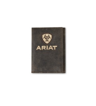 This Ariat trifold wallet by M&F Western Products is genuine brown crazy horse leather and has Ariat name embroidered in a cream color and Ariat logo outlined in dark brown on the front