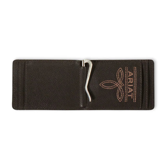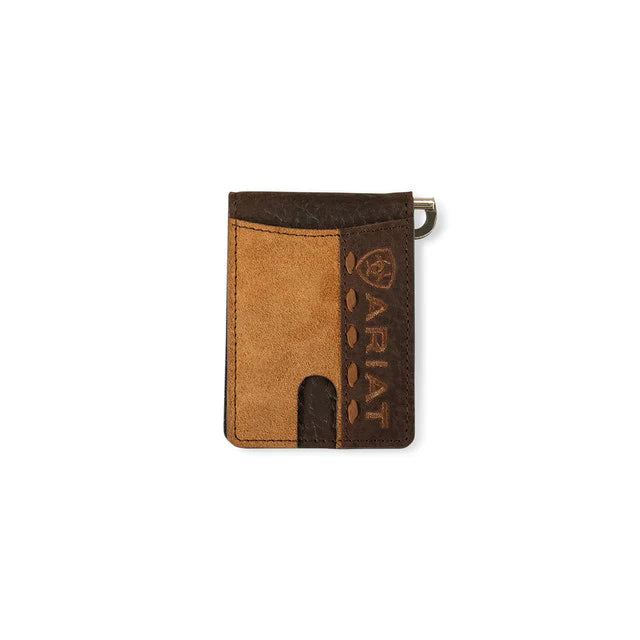 This Ariat money clip wallet by M&F Western Products is genuine leather. Classic roughout body with a chocolate rowdy leather overlay and buck lace stitching. Embroidered Ariat logo and name. Card and ID window on the inside. Spring money clip on the outside.