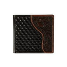 This Nocona large bifold wallet by M&F Western Products is genuine leather. Features basket weave embossing with a floral embossed overlay in the right corner. Multiple card slots, cash slot and ID window on the inside.