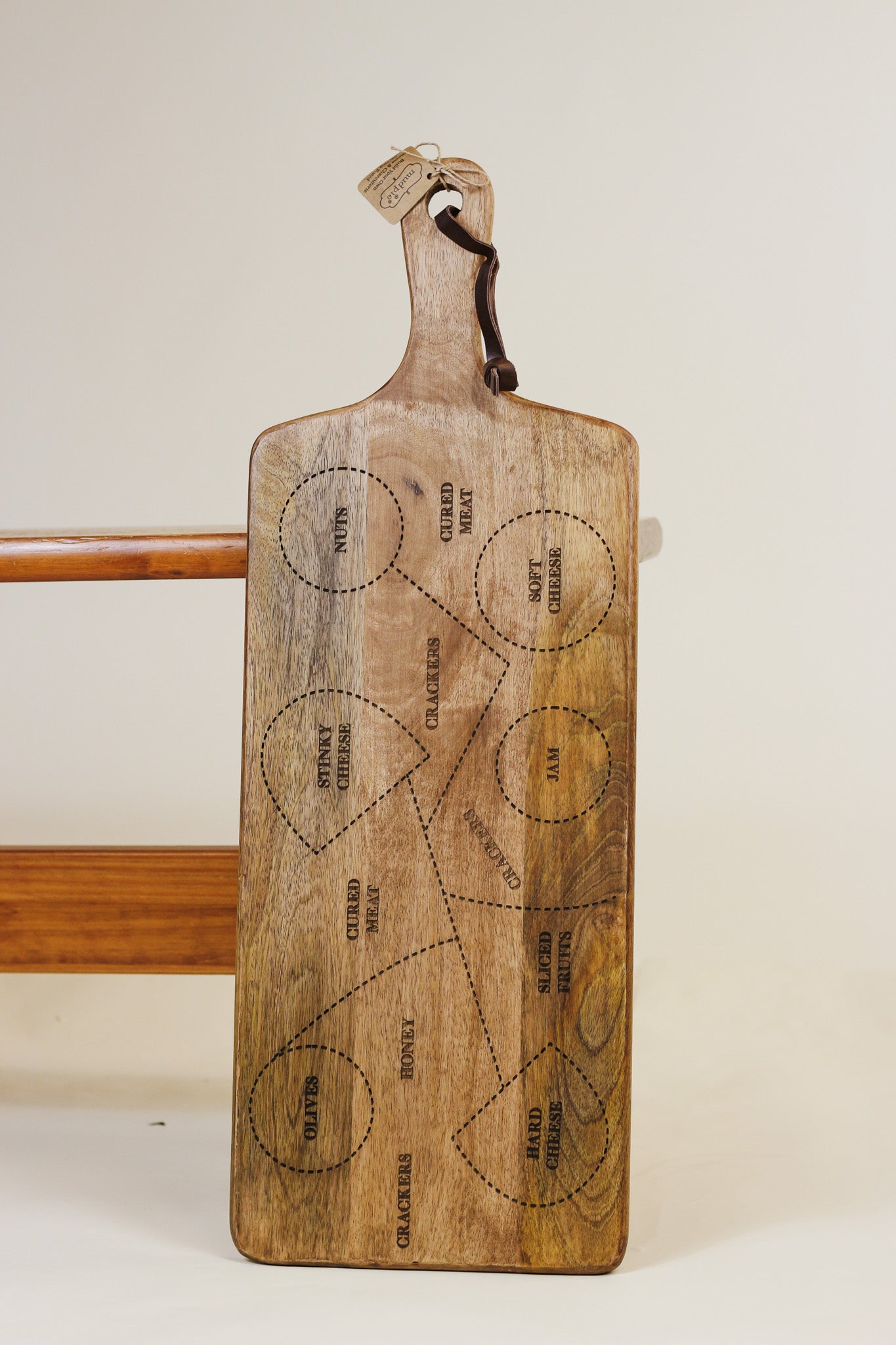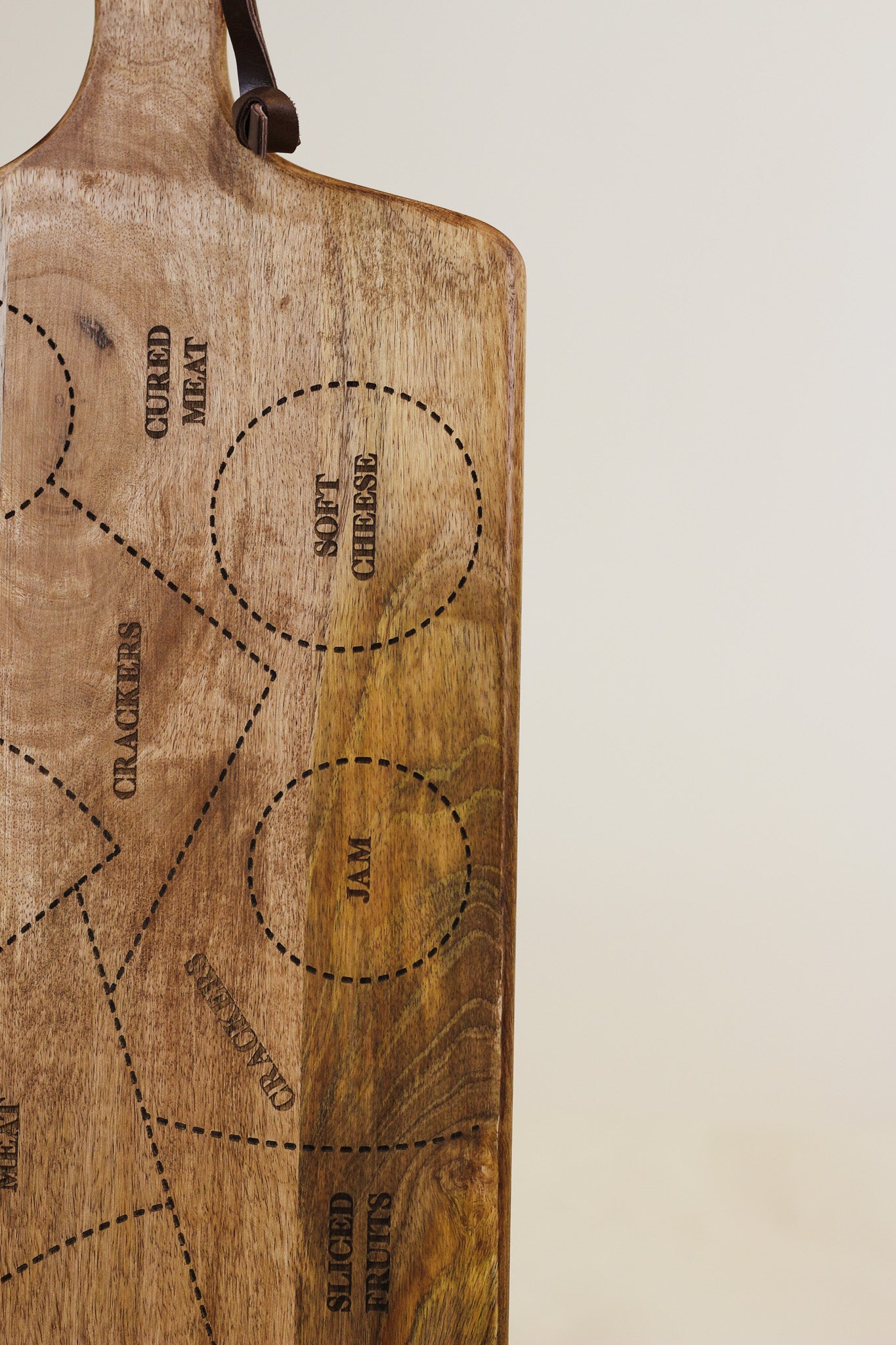 Assemble the perfect charcuterie board with our charcuterie serving board. The mango wood paddleboard features a genuine leather handle loop. The top of the board features an engraved surface diagram guide for building a successful charcuterie board including where to place cheeses, meats, crackers, and more to make the perfect cheeseboard. This is great for beginner cheese-board enthusiasts and makes it easy to create your own charcuterie creation.