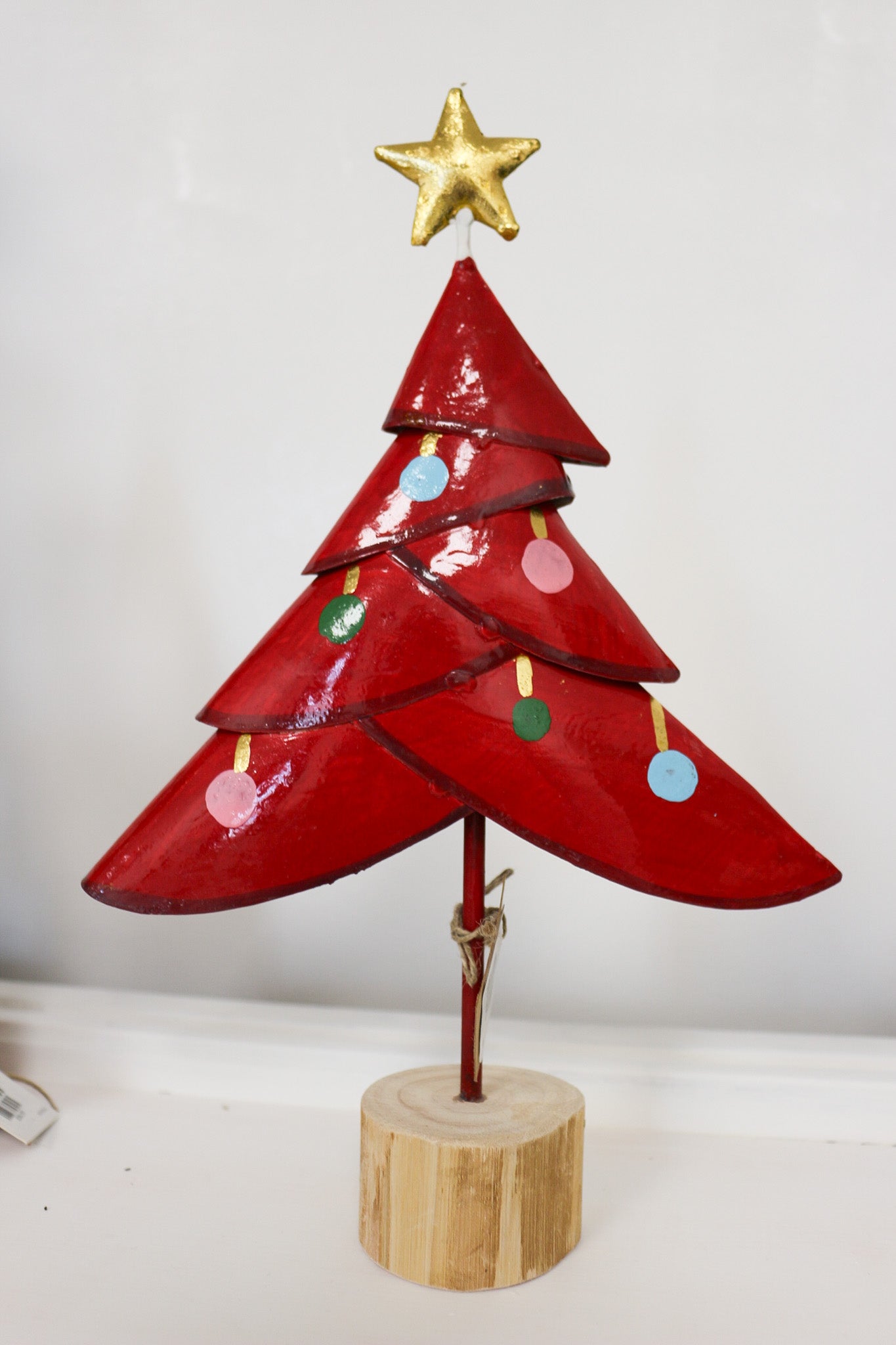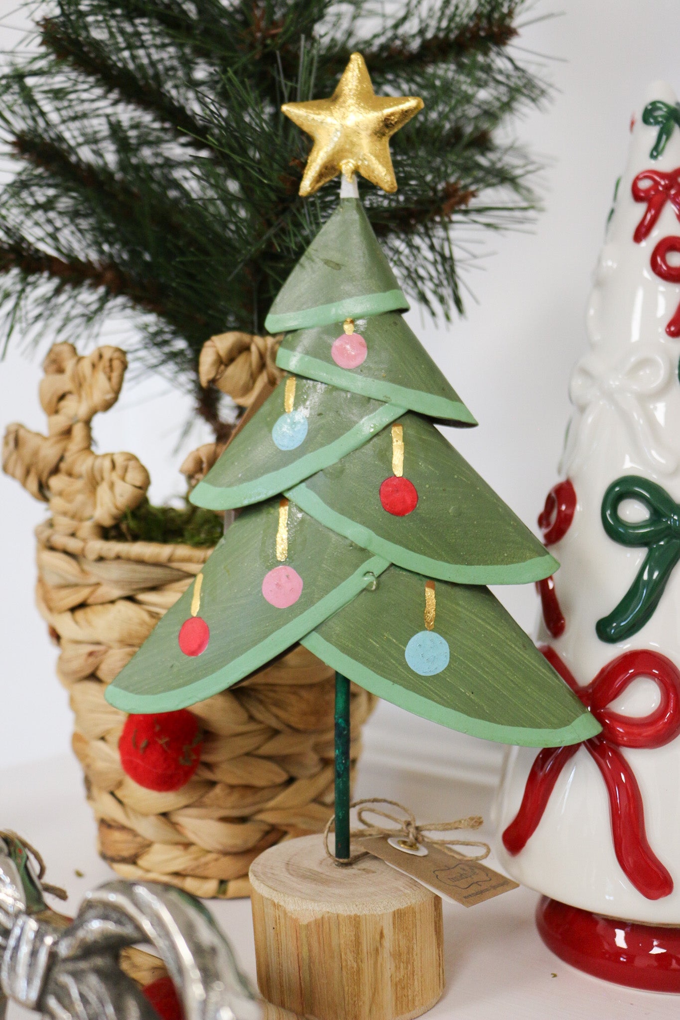 Metal Christmas tree sitter with wooden tree trunk base.