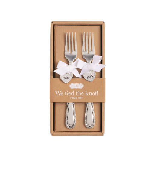 Celebrate your first meal as a married couple with this elegant and whimsical Mr. & Mrs. Charm Fork Set. Specifically designed for the iconic wedding cake cutting ceremony, these vintage-inspired metal forks feature delicate heart charms and classic white ribbon accents. Housed in a charming "We tied the knot!" gift box, this set serves as both a functional wedding essential and a cherished heirloom for years of anniversaries to come.