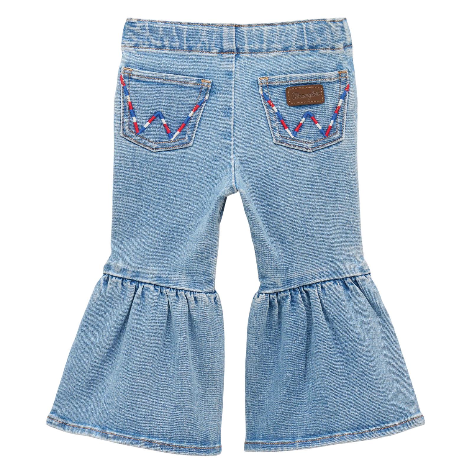 Dress your little cowgirl in style with the Wrangler® Baby Girl Flare Jean (Sky). Crafted with soft, durable denim, these jeans provide comfort for all-day play while maintaining a classic western-inspired look.