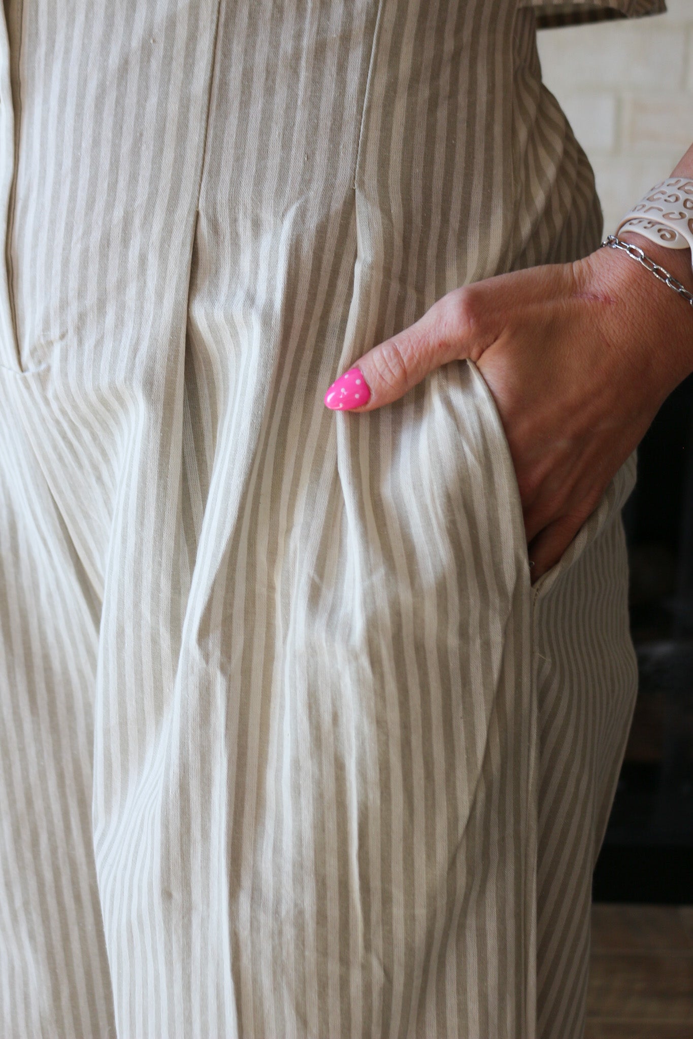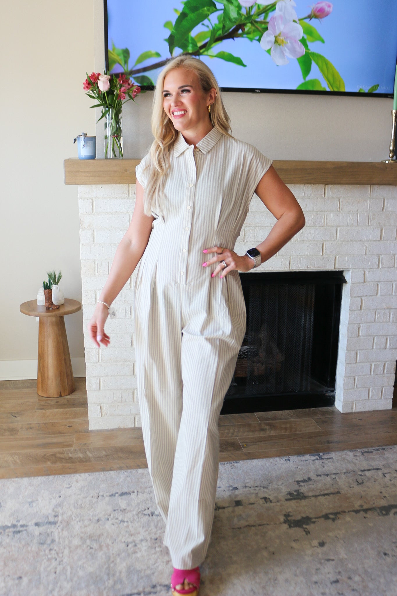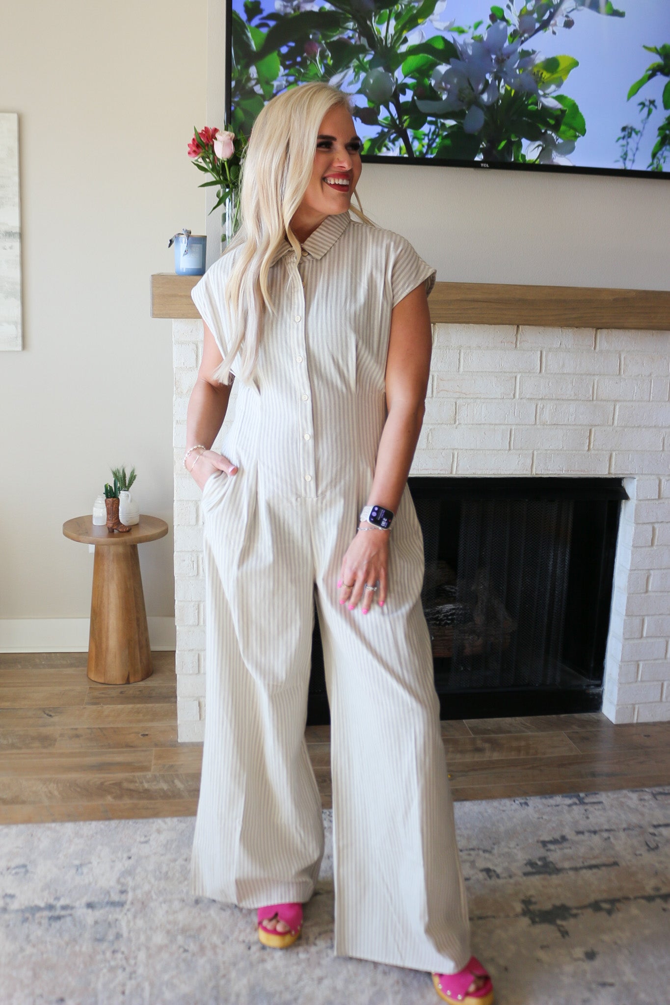 Slip into effortless style with this light taupe striped jumpsuit, complete with a cheeky cut-open back that's ready to turn heads. Perfect for date night, brunch, or whenever you want to feel confident and a little bit daring. The relaxed fit keeps you comfortable while the bold back detail makes a statement. Pair with your favorite heels or sneakers—this versatile piece works with everything.