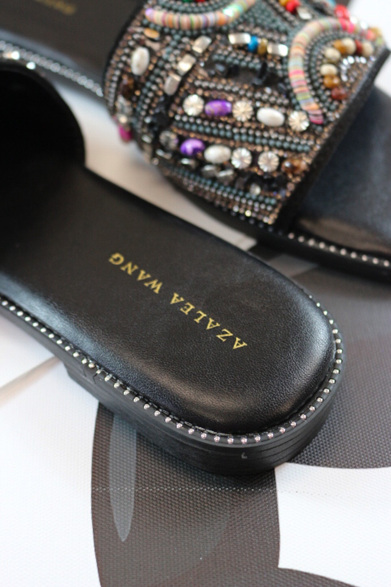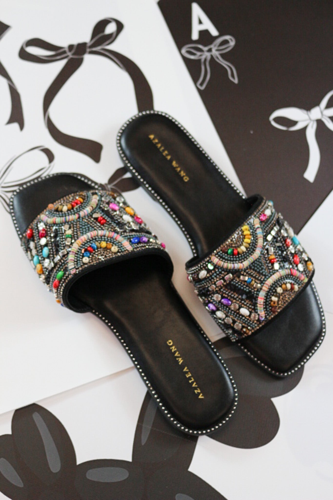 Upgrade your summer style with the ESSERE. Slip into these stylish black faux leather sandals, adorned with a colorful crystal embellished foot strap. Perfect for any vacation outfit, these sandals add a chic flair to any casual look.