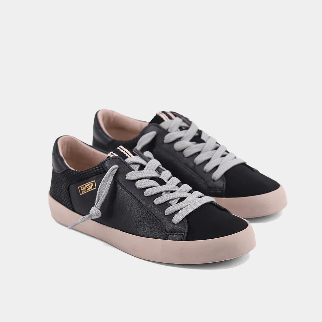 Step up your sneaker game with the REBEL in Black. Crafted with a textured faux snakeskin back and smooth faux leather panels, this pair makes an effortless statement. Finished with a lace-up front, comfy rubber sole, and our signature SHUSHOP gold tag, these sneakers are your new go-to for bold yet wearable looks.