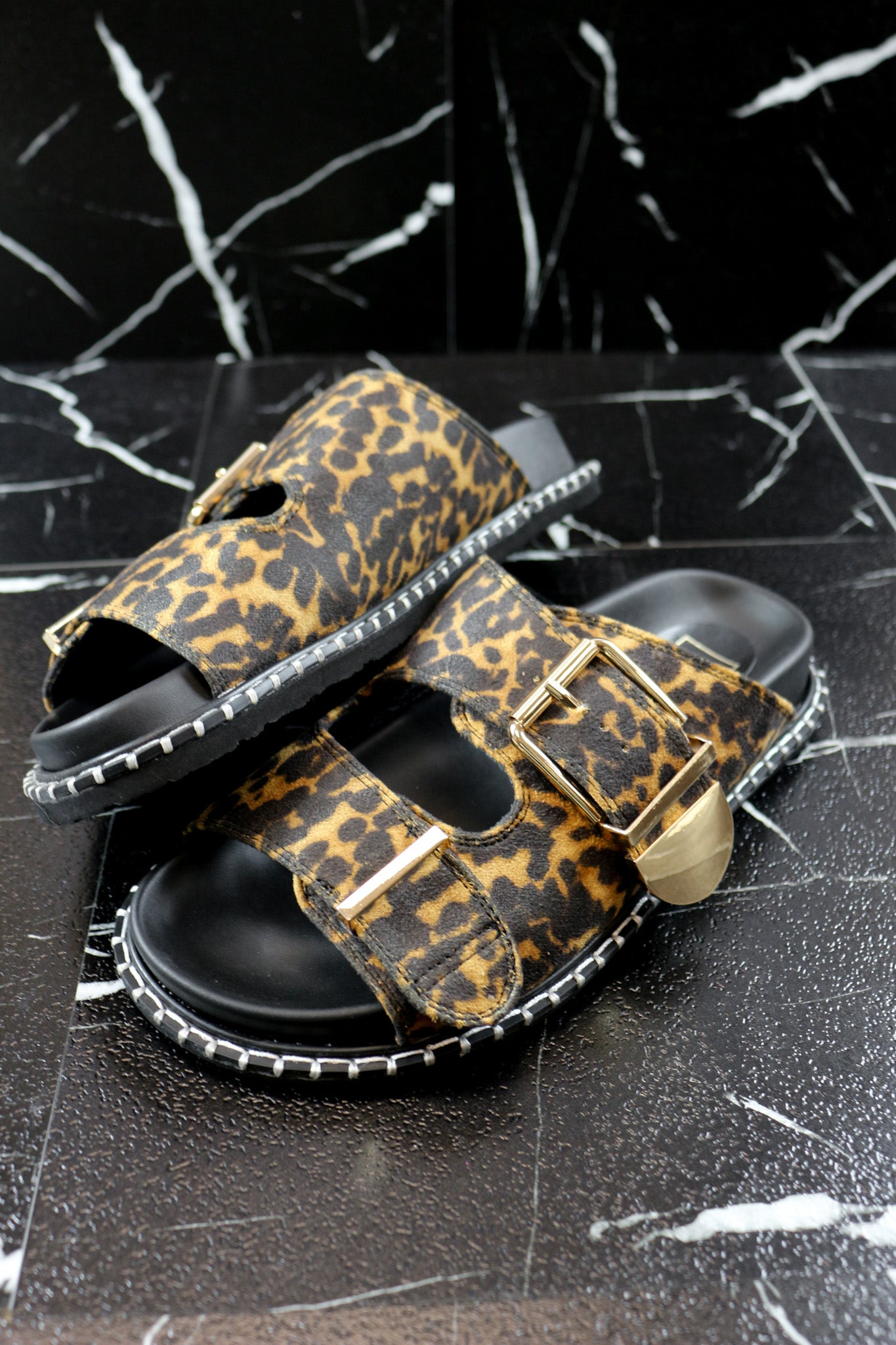 Make a bold statement with the CHARLOTTE sandal in luxurious leopard-print suede and faux leather. Designed with dual wide straps, gold-tone buckles, and a crest accent, this sandal blends fierce elegance with modern edge. The contrast-stitched sole and cushioned footbed offer all-day comfort, making it the perfect mix of wild and chic.