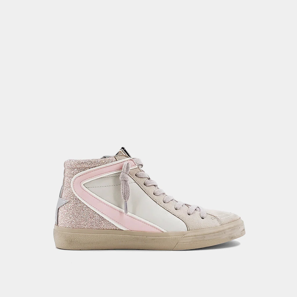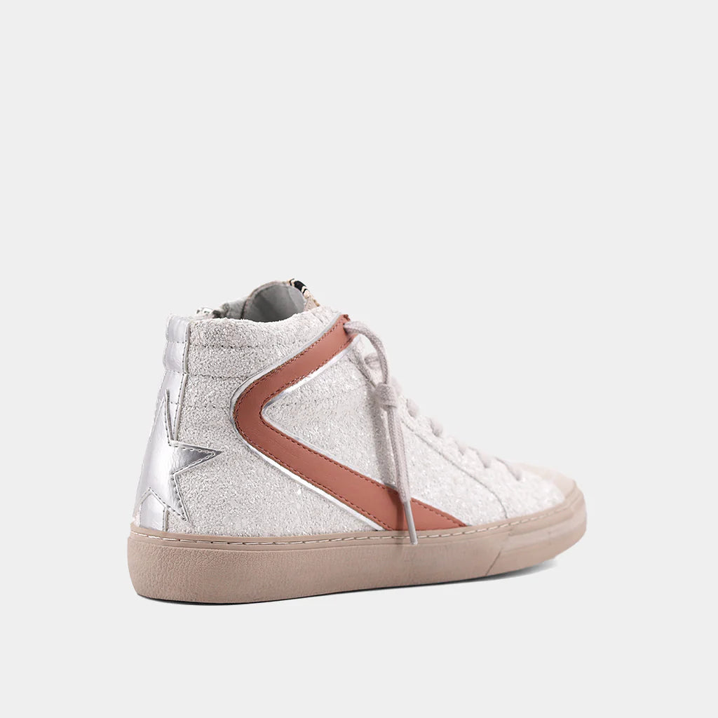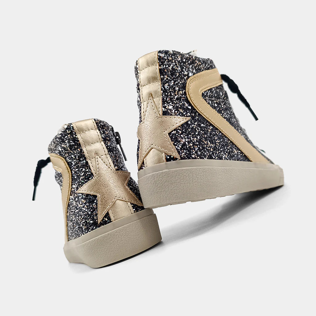 Our high-top sneakers named ROONEY are renowned for their exceptional style and versatility. This pair of sneakers is designed with glittering faux leather, suede panels, and colorful embellishments. You can pair them with anything, which makes them a great addition to your wardrobe.