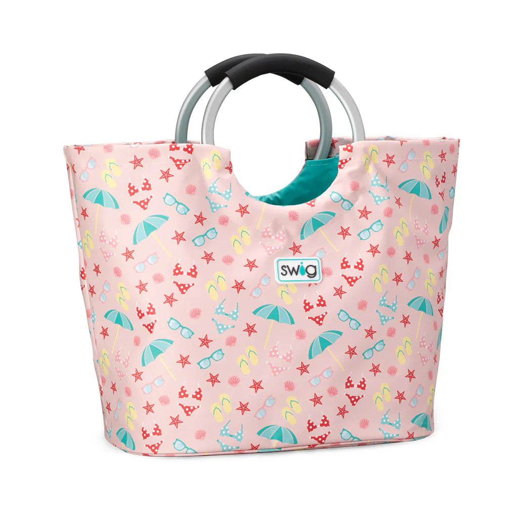 It's a tote, it's a pool bag, it's a Loopi! 🤩 Errbody this summer is getting tipsy with Swig! 🍹 This drinking buddy design comes party ready with sunglasses, flip flops, and umbrellas on a pale pink background.