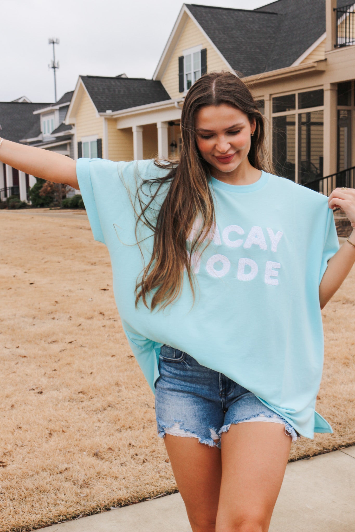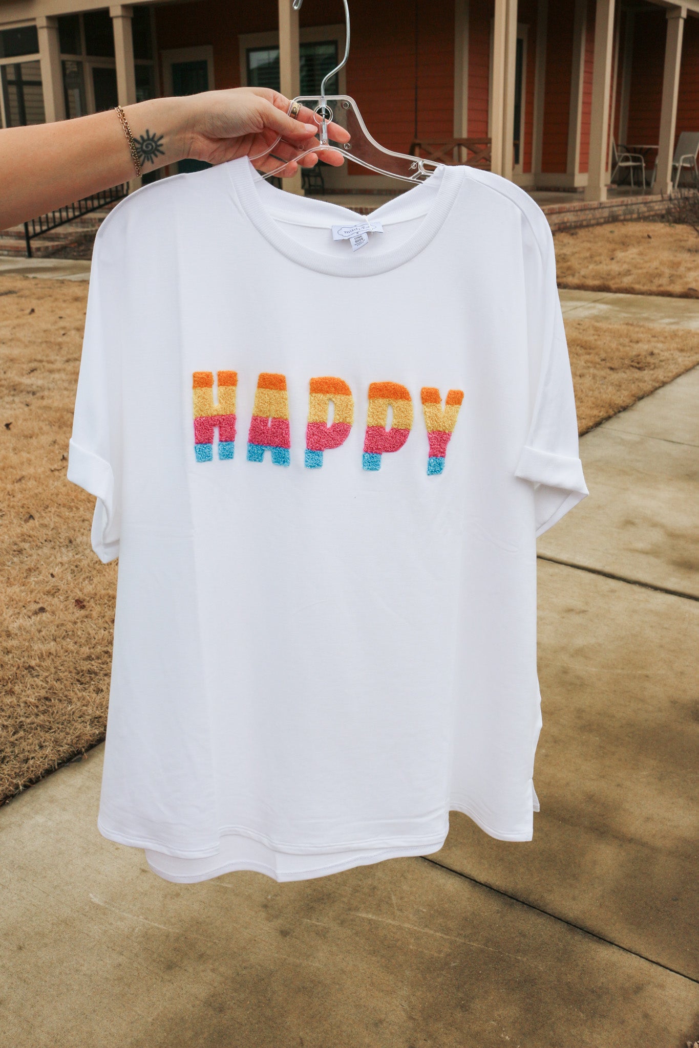 It features bouclé embroidery patch lettering, which adds a playful and trendy touch. The tee is designed to fit most body types and measures approximately 27 1/2" from shoulder to hem, providing a flattering length.