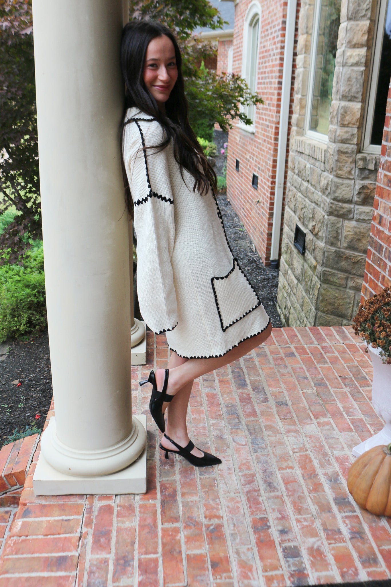 Elevate your wardrobe with the Tarla Sweater Dress, a striking blend of refined elegance and contemporary edge. This sophisticated piece features a luxurious cream and black colorway that effortlessly transitions from day to evening. The sweater dress silhouette offers comfort without compromising style, making it an essential addition to any modern closet. Perfect for layering or wearing solo, this versatile dress delivers understated confidence with every wear.