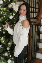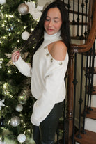 Off-the-shoulder style meets cozy comfort in this charming white sweater. The playful button details add a touch of personality while the open shoulder design keeps things fresh and flirty. Perfect for casual outings or dressing up your everyday look, this piece transitions seamlessly from season to season. Soft, versatile, and undeniably cute—your new go-to sweater awaits.