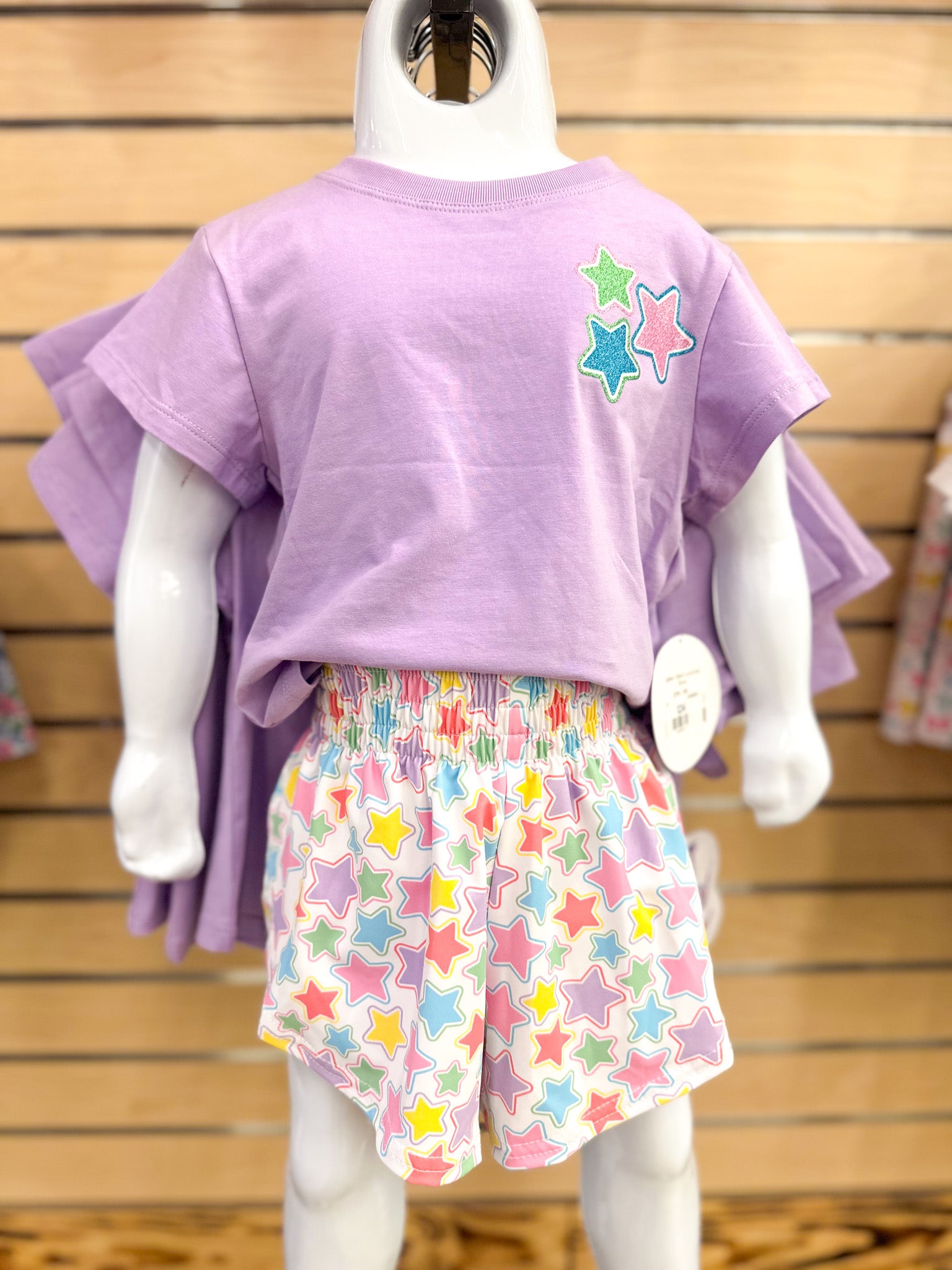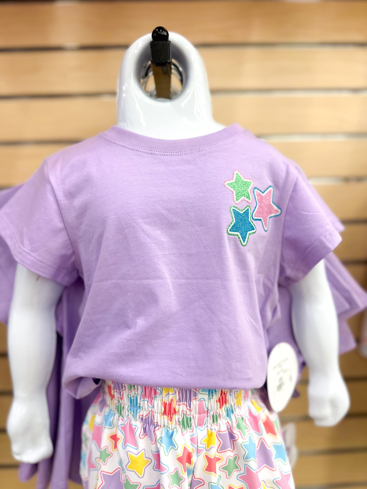 Twinkle, twinkle, little star—now your girl can wear one! This lavender tee features shimmering glitter stars that catch the light with every move. Soft, comfortable, and perfect for everyday adventures, it's the ideal pick for kids who love a touch of sparkle and magic. Machine washable for easy care.