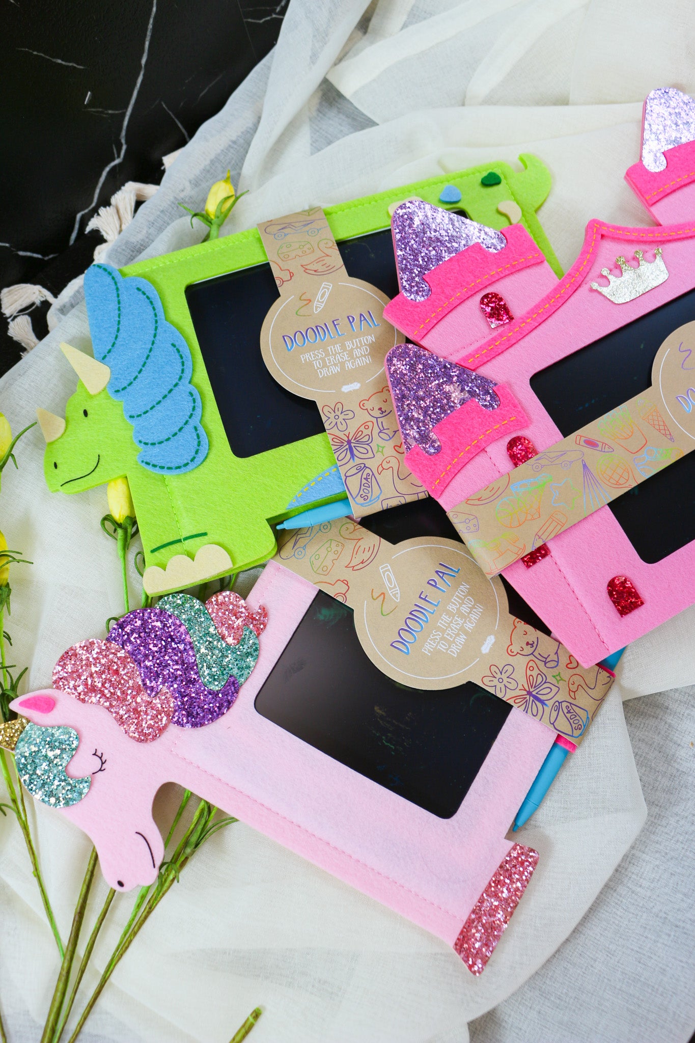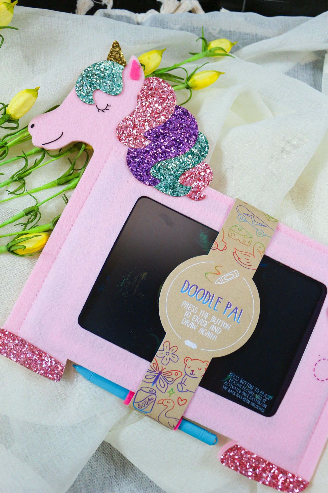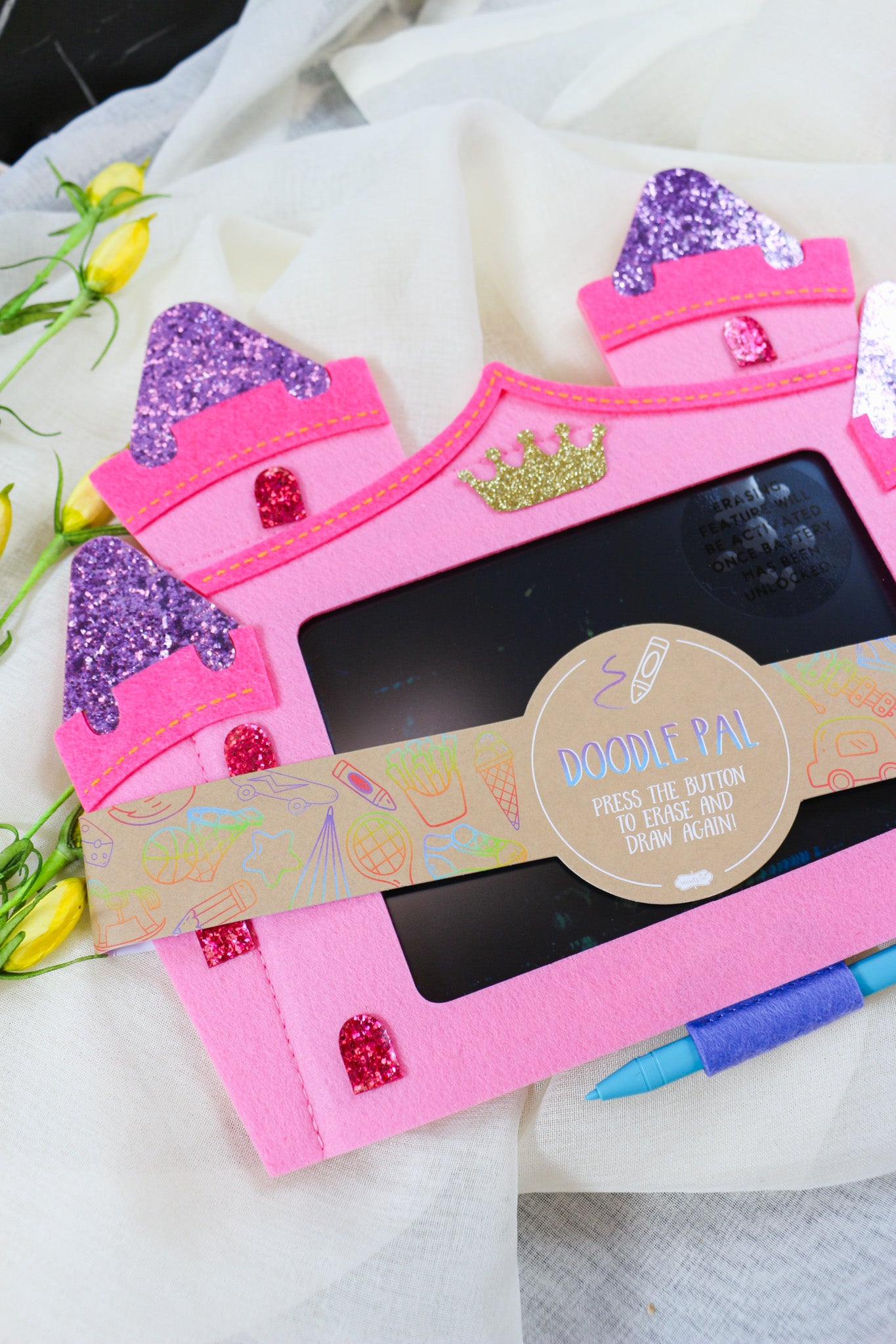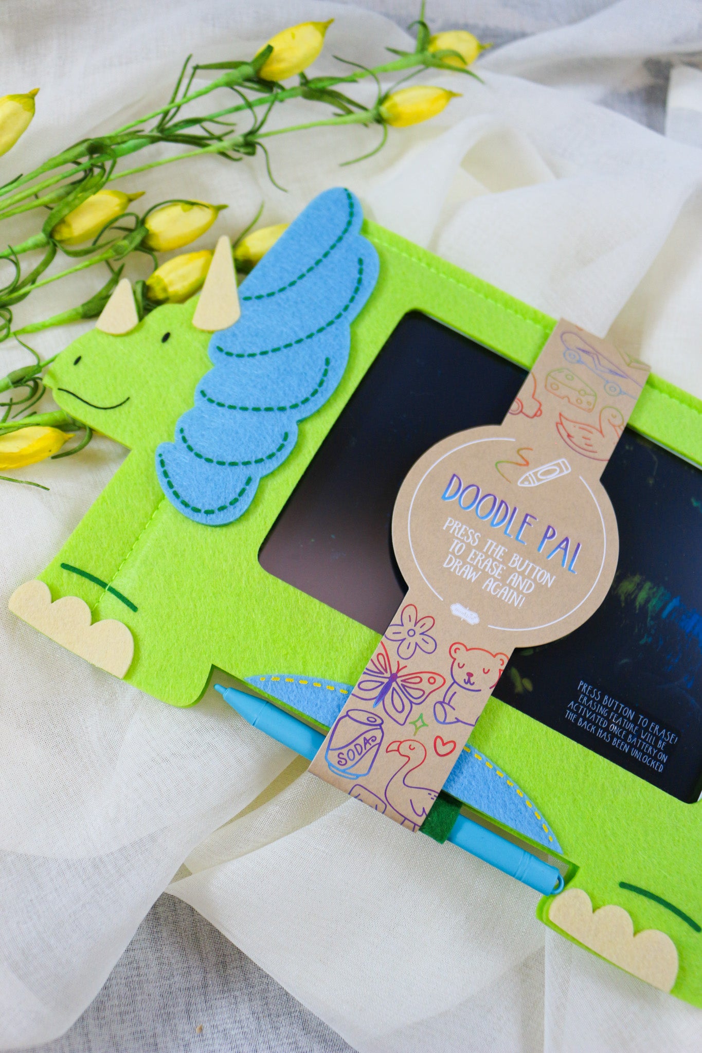 This vibrant and engaging writing tablet features a pressure-activated liquid crystal display that allows children to doodle, draw, and erase with ease. The attached stylus pen ensures precision and convenience, while the one-touch erase button makes it simple to start fresh with a new masterpiece. Encased in a charming felt figural cover, this doodle pad is both fun and functional, providing a delightful tactile experience. Designed for children ages 3 and up, it comes with batteries included, ensuring immediate use. With dimensions of 10" x 11 3/4", it's perfectly sized for little hands to explore their creativity anywhere.