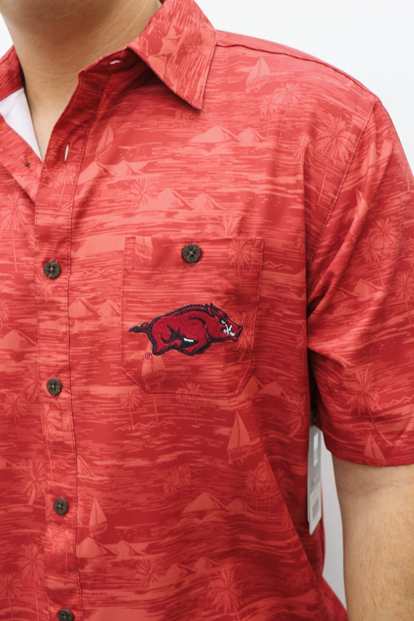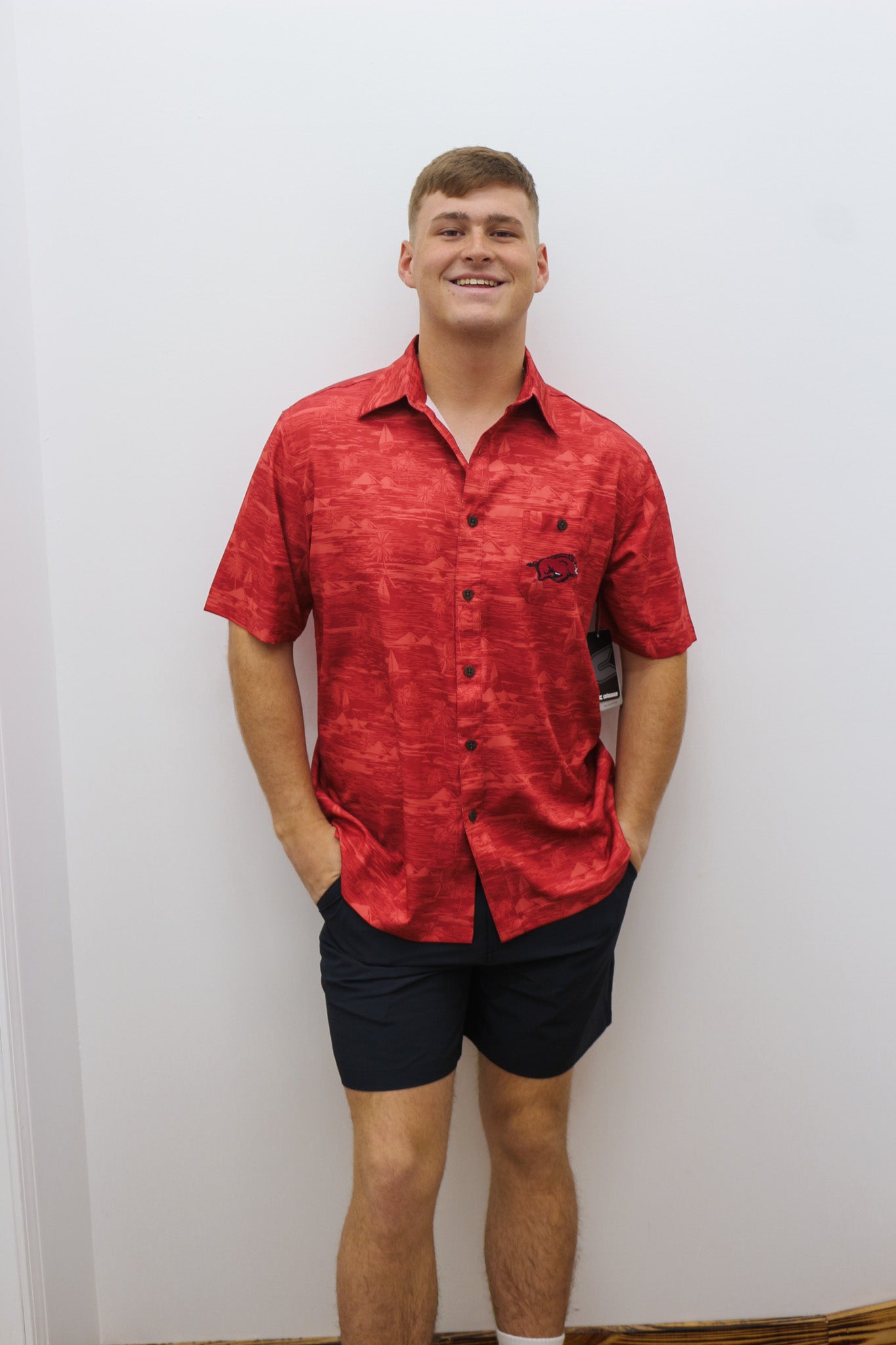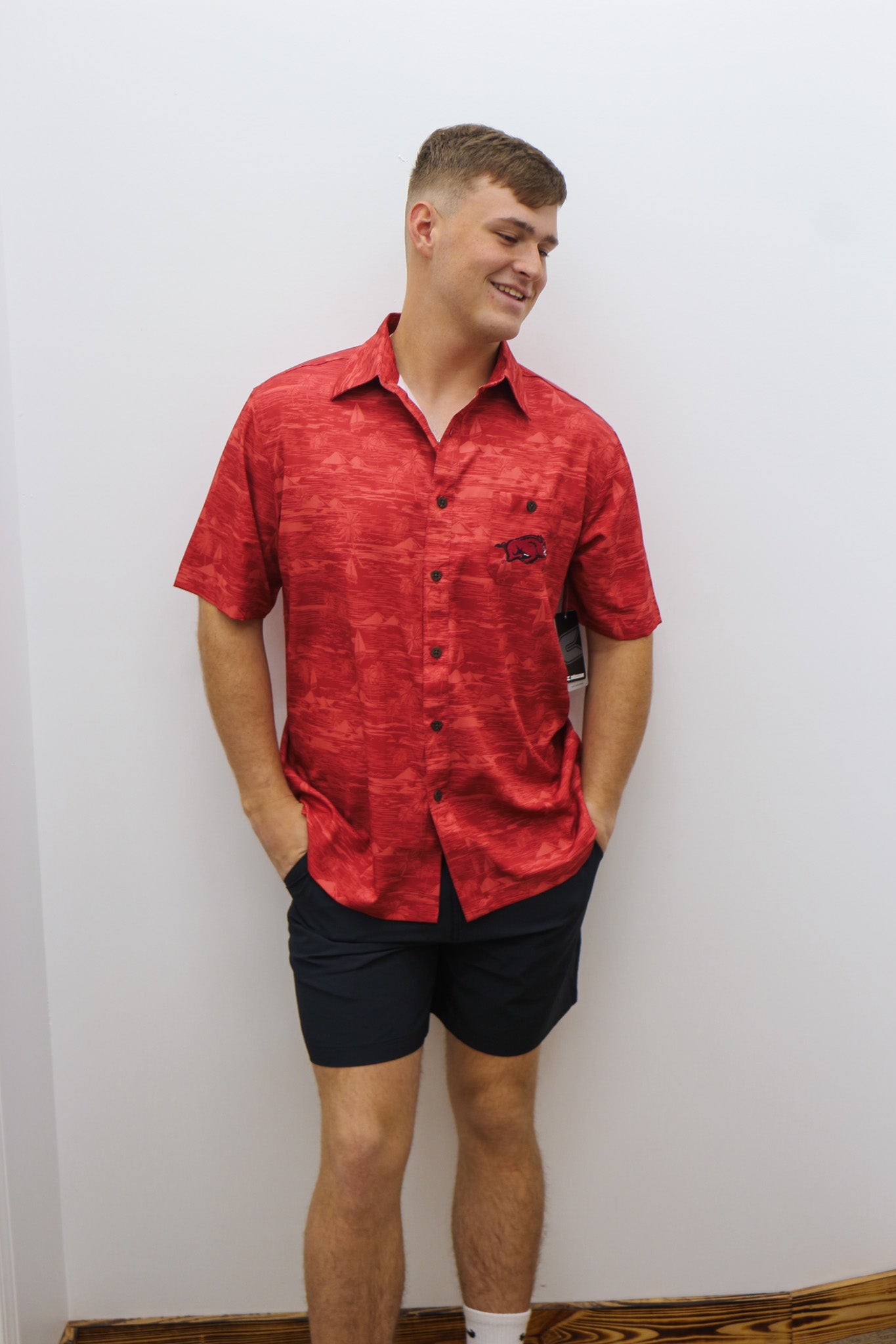 Add a pop of team spirit to your wardrobe with our Arkansas Razorback Red Tropical Button Up. Featuring a vibrant red color and a fun tropical print, this button up is perfect for game day or any casual occasion. Made with high-quality materials, it offers comfort and style in one.