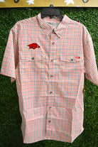 Woo Pig Sooie in the Drake Frat Tattersall. The Frat is made from 95% polyester and 5% spandex. The performance fabric is lightweight at 95 GSM which allows moisture to wick quickly from the body. It also has a UPF30 rating for sun protection for those September afternoons in Fayetteville. It has a natural stretch for ease of movement, a classic fit, a hidden button-down collar, two button-through flap chest pockets, and a vented cape back. It has a sculpted hem which allows you to wear tucked or untucked. Classic styling and technical features put The Drake Frat Tattersall in a class by itself.