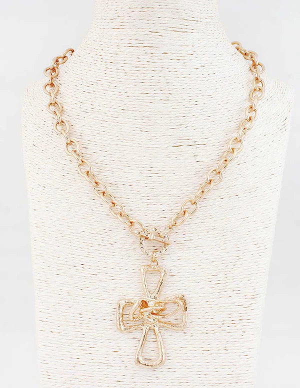 Elegant gold chain necklace featuring an adjustable 16"-18" length and a striking hammered cross toggle charm. The textured cross design adds dimension and sophistication, while the toggle closure ensures a secure, comfortable fit. Perfect for layering or wearing solo, this versatile piece complements both casual and dressed-up looks.