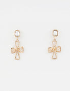 Vintage-inspired worn gold finish brings timeless elegance to these hammered cross drop earrings. The textured surface catches light beautifully, while the 1.5" length offers a balanced, flattering drop. Perfect for adding spiritual style or bohemian charm to any outfit. Lightweight and comfortable for all-day wear.