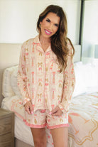 Step into the New Year with the Bows & Bubbly Ruffle Pajama Set. This charming set includes a long-sleeve cream collared top adorned with vintage-inspired details and champagne bottle accents, accompanied with coordinating shorts. It offers the perfect blend of comfort, coziness, and stylish elegance for your bedtime style!
