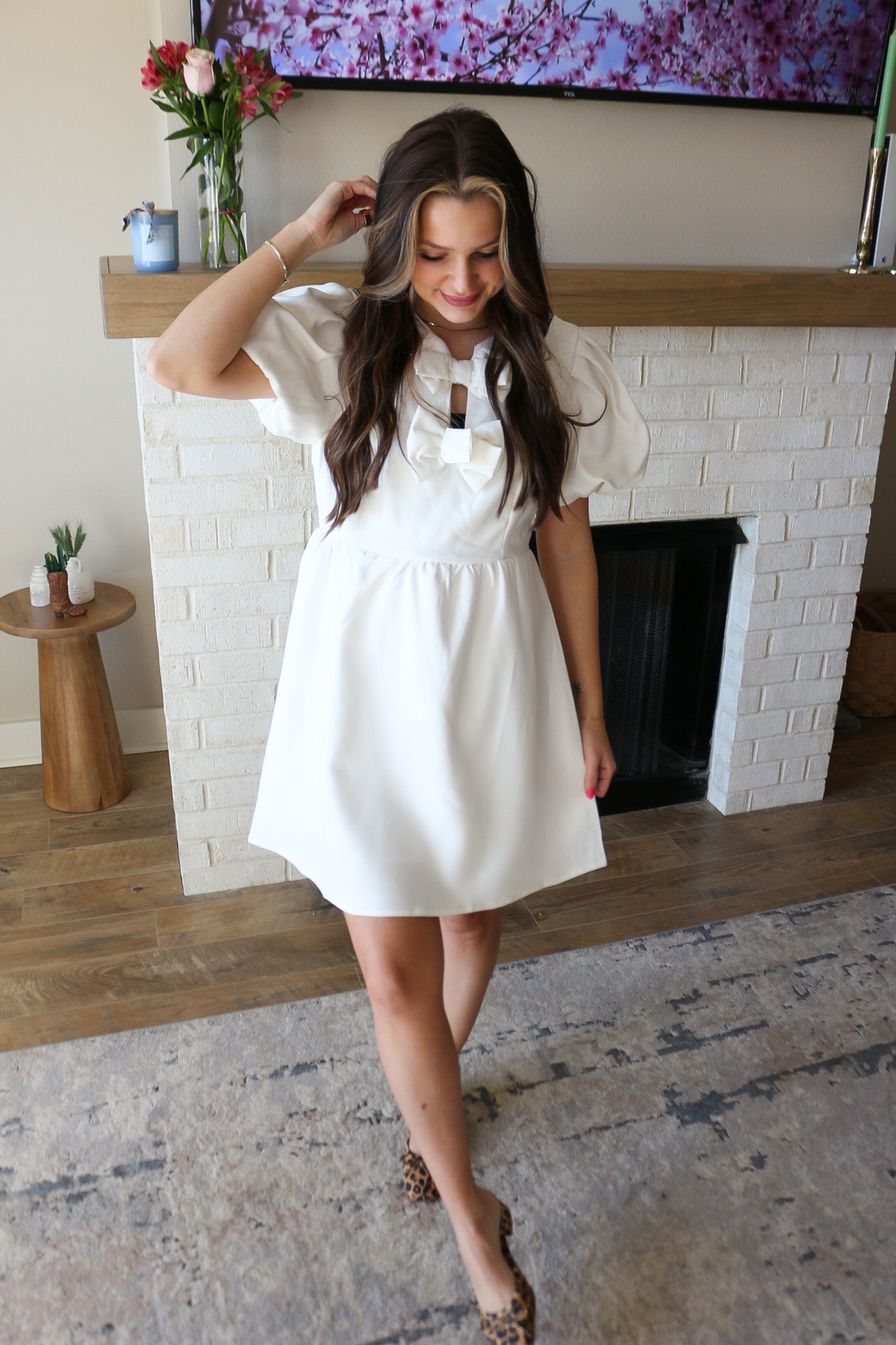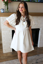 Twirl into romance with this charming off-white dress that tells your love story. The delicate bow detail at the neckline adds a sweet, vintage-inspired touch, while the flattering V-neck creates an elegant silhouette. Short puff sleeves bring playful femininity to every moment—whether you're dressing up for a special occasion or adding a touch of whimsy to your everyday style. Perfect for anyone who loves retro-romantic details with modern comfort.