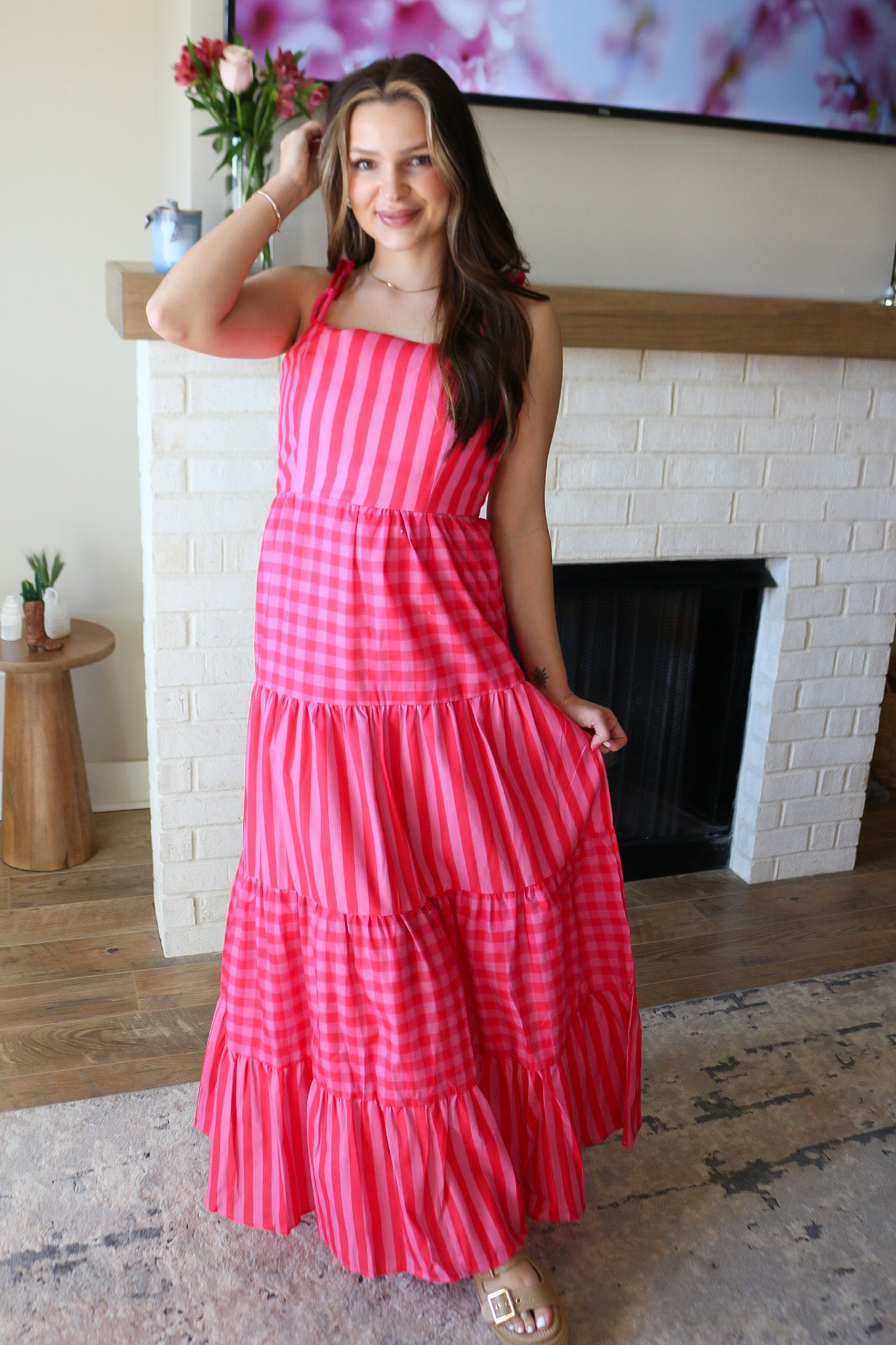 Beach Date Pink Red Stripe Tiered Maxi Dress