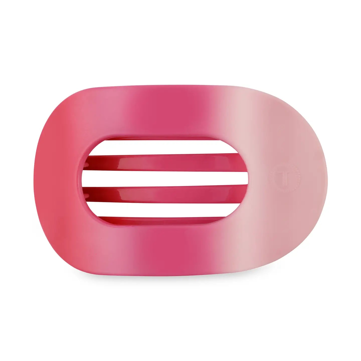 Lay flat and relax with the new TELETIES Kiss & Tell Medium Flat Round Hair Clip in Pink. Hand-sprayed for a one-of-a-kind pink and red ombré—expect slight variations in each clip. This hair clip is designed to allow you to lay back flat, do yoga, or sit comfortably in a seat with a headrest, and it is made with the same material that is nearly unbreakable.