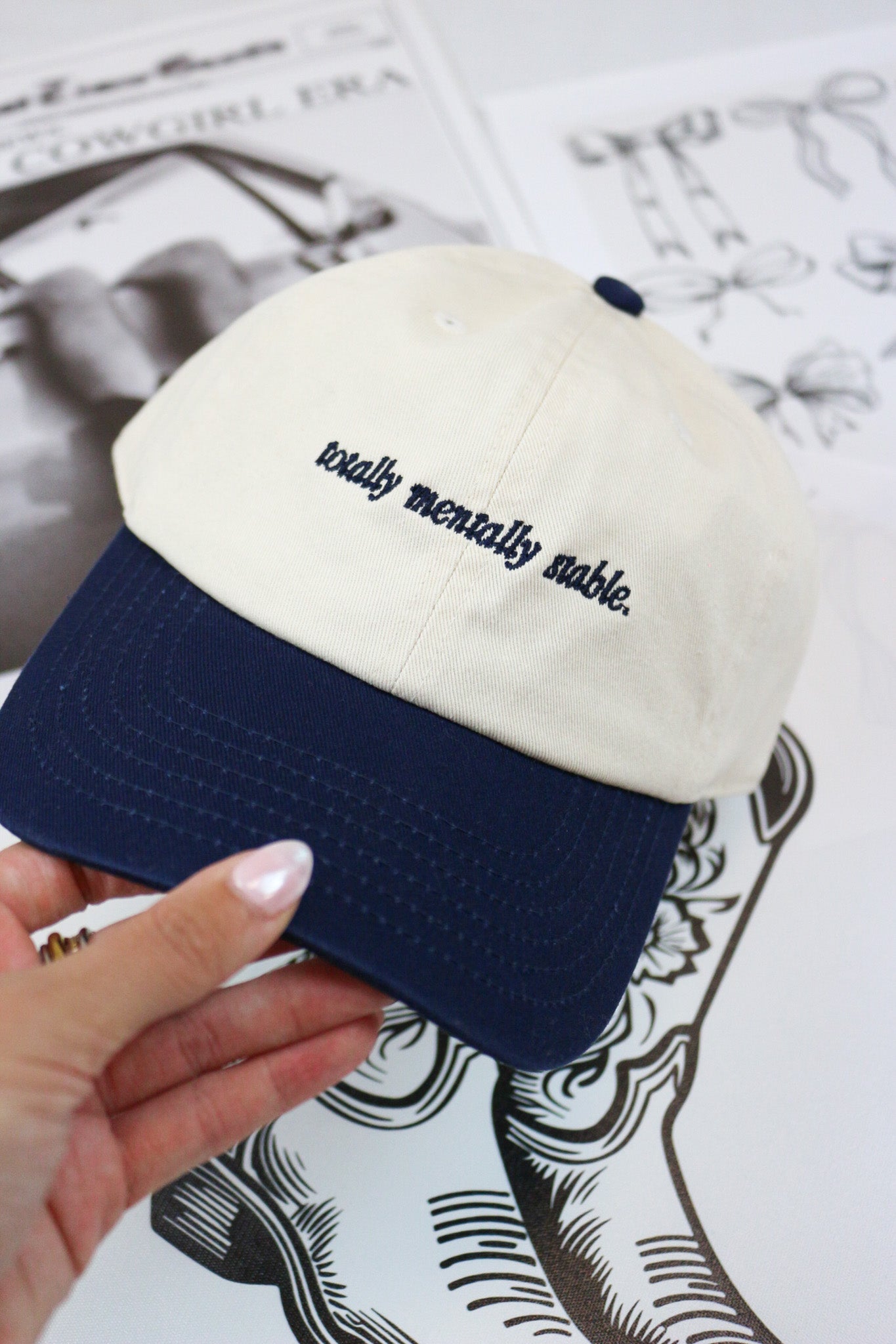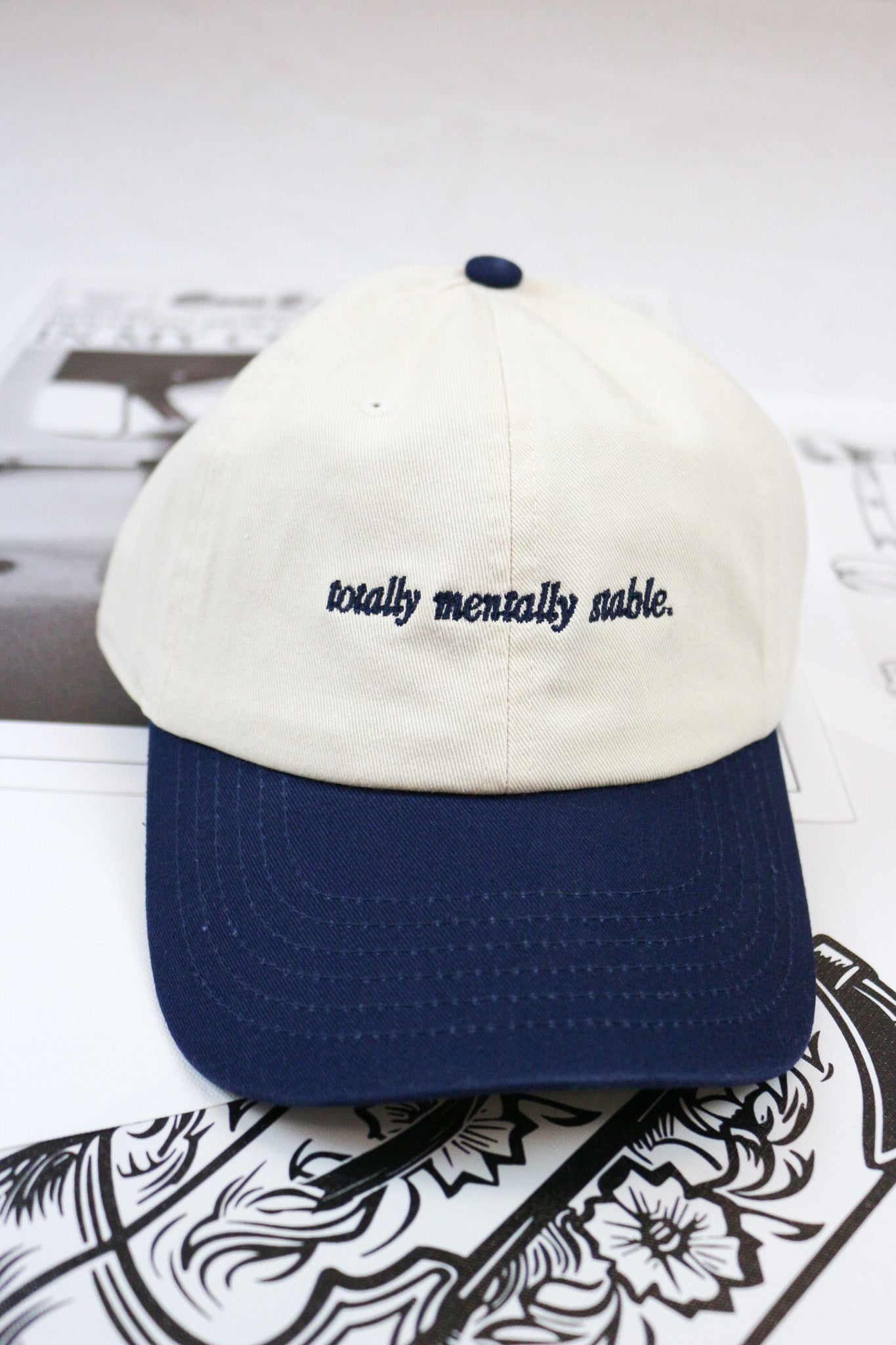 Two-toned navy and natural dad cap - this is going to be a traditional dad cap/baseball cap fit! Low profile, no structure, and sooo giving early 2000's