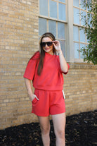 Dive into comfort with the Safe Surroundings Laguna Brick Scuba Short Set—where bold color meets laid-back style. This playful two-piece features a rich brick tone paired with laguna accents, perfect for making waves at the beach or poolside. The scuba fabric delivers a soft, stretchy fit that moves with you, while the coordinated set takes the guesswork out of summer dressing. Whether you're lounging by the water or catching some rays, this set brings retro-inspired flair with modern comfort.