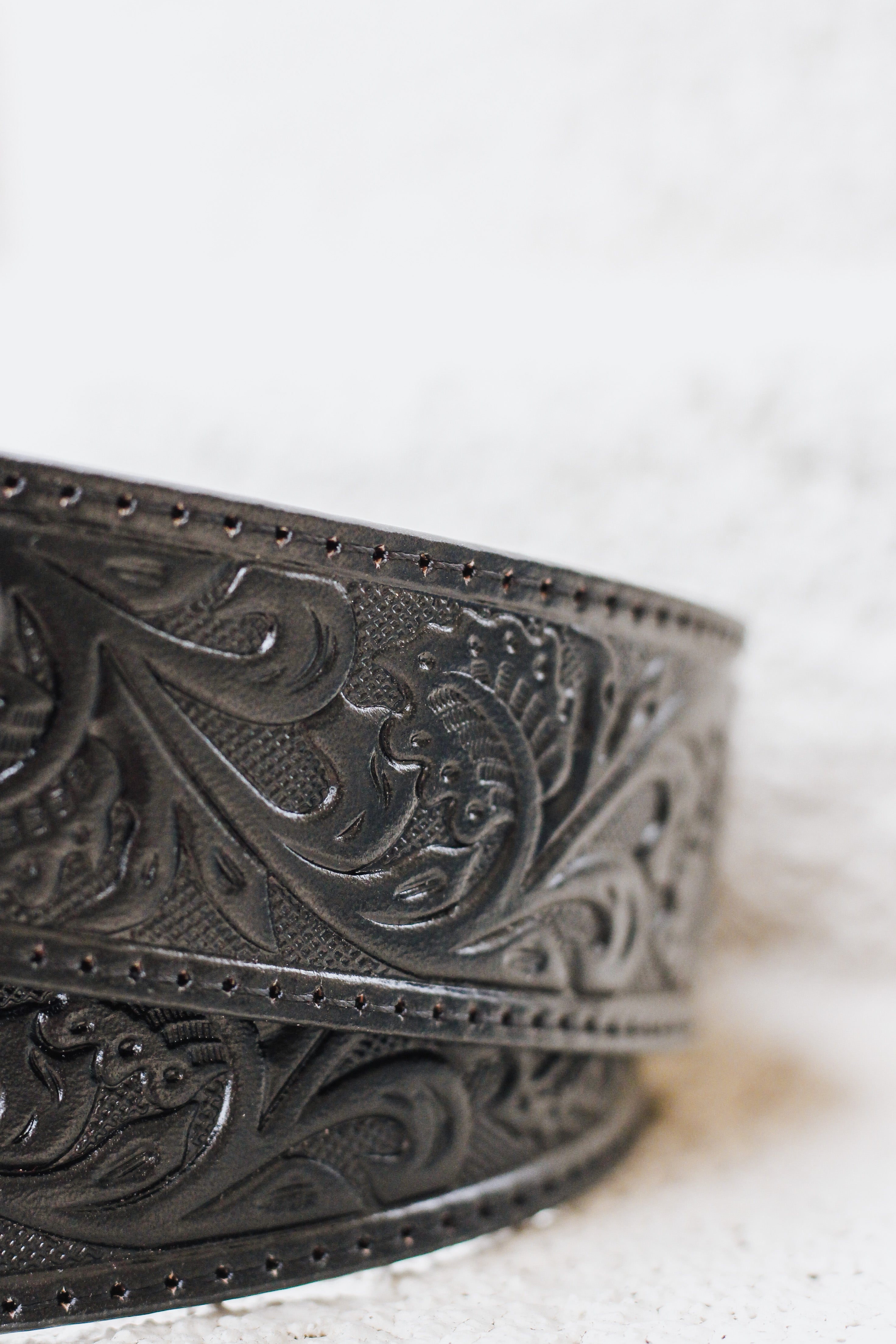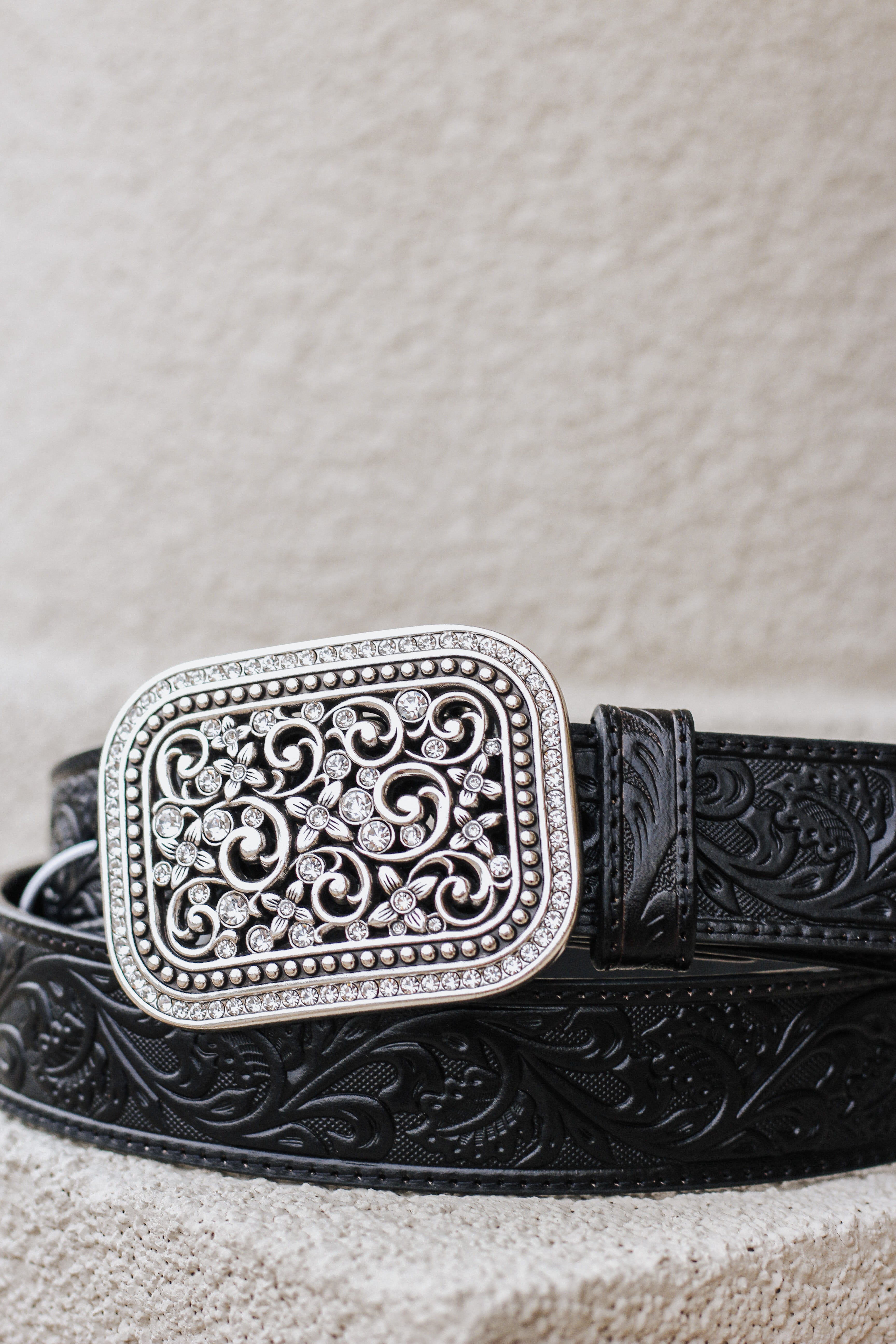 This Ariat belt by M&F Western Products features a beautiful black embossed strap with an ornate silver buckle that sparkles with rhinestones. This is a great western belt that will look great with your favorite jeans. Belt is 1.5 wide.