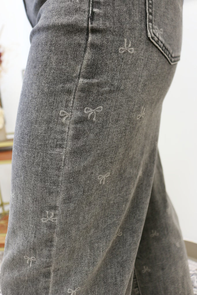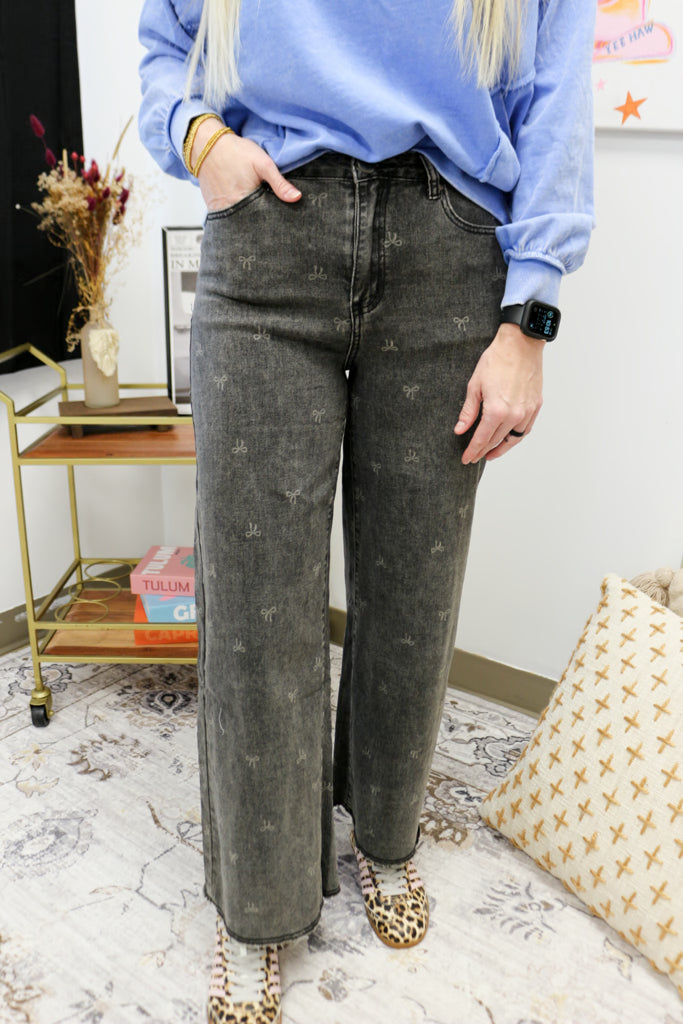 Elevate your everyday denim with our Statement Maker Bow Pants. Combining the ultra-trendy "coquette" aesthetic with a classic wide-leg silhouette, these jeans feature a delicate all-over bow print on a perfectly lived-in black denim wash. Crafted with premium stretch fabric and a flattering high-rise fit, they offer the perfect balance of feminine charm and streetwear edge. Whether you're dressing them up for brunch or keeping it casual, these are the high-waisted statement pieces your closet has been craving.
