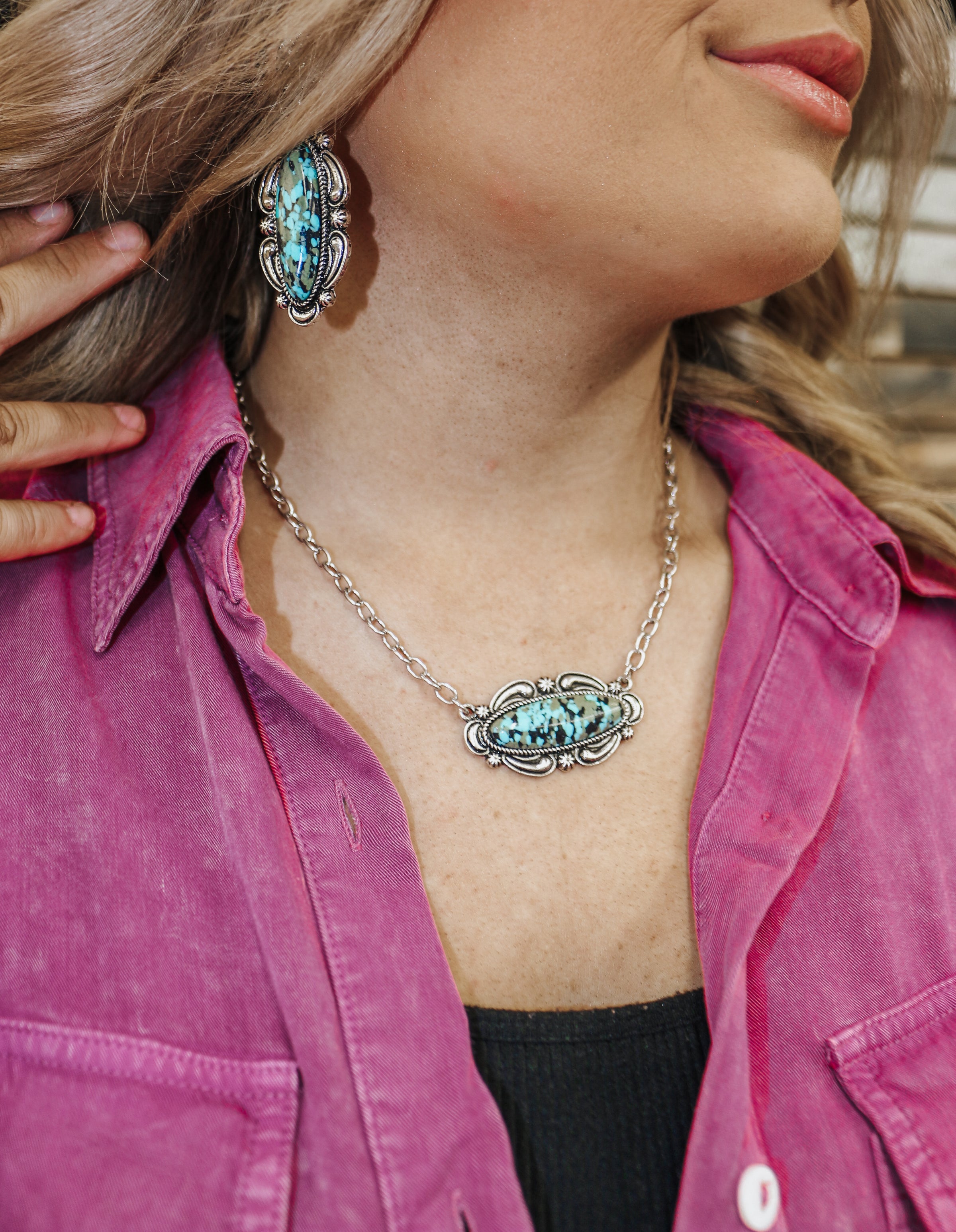 Trendy Blazin Roxx ladies earrings and necklace set by M&F Western Products. Oblong marble look pendants with silver accents and chain.