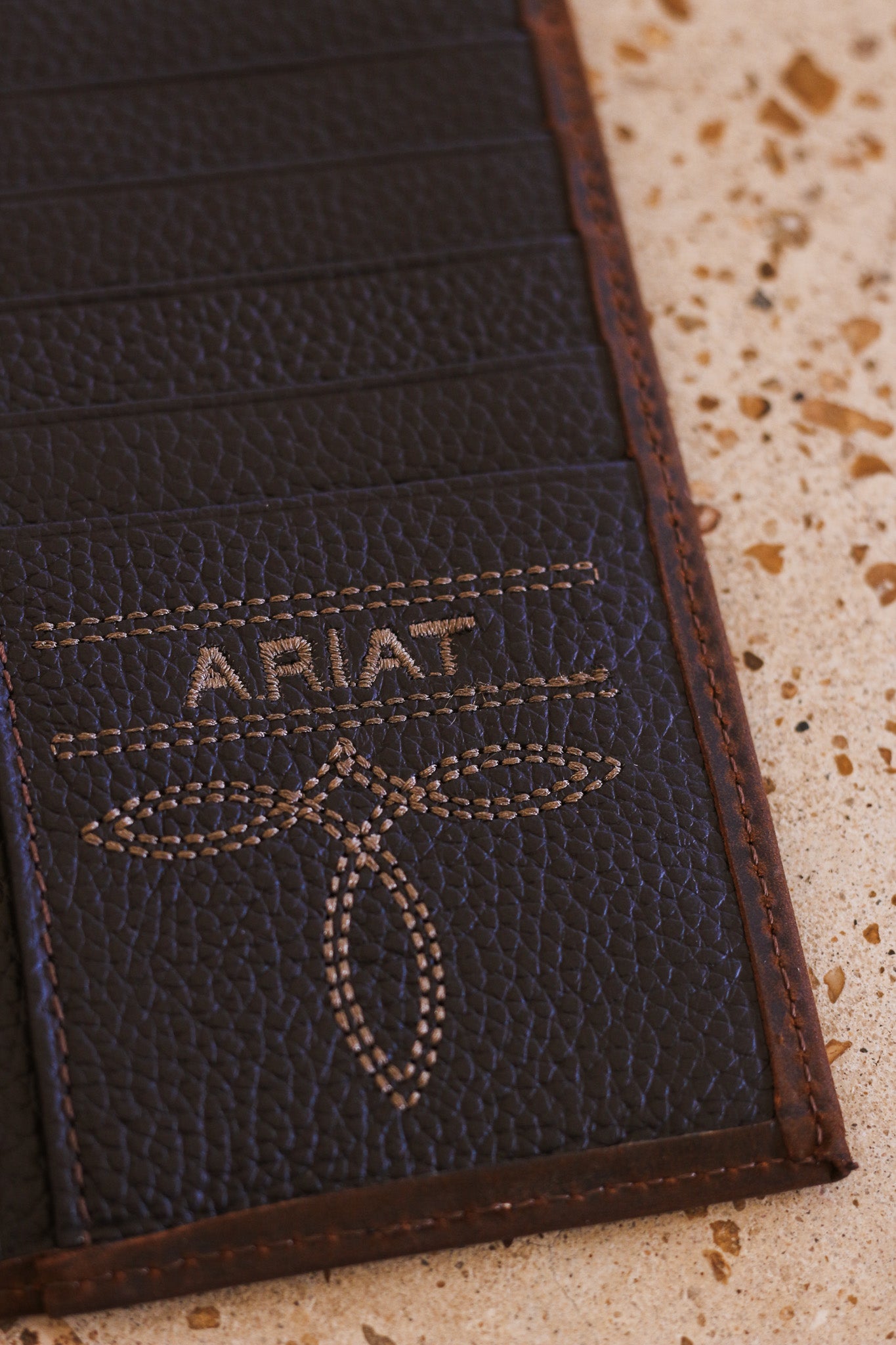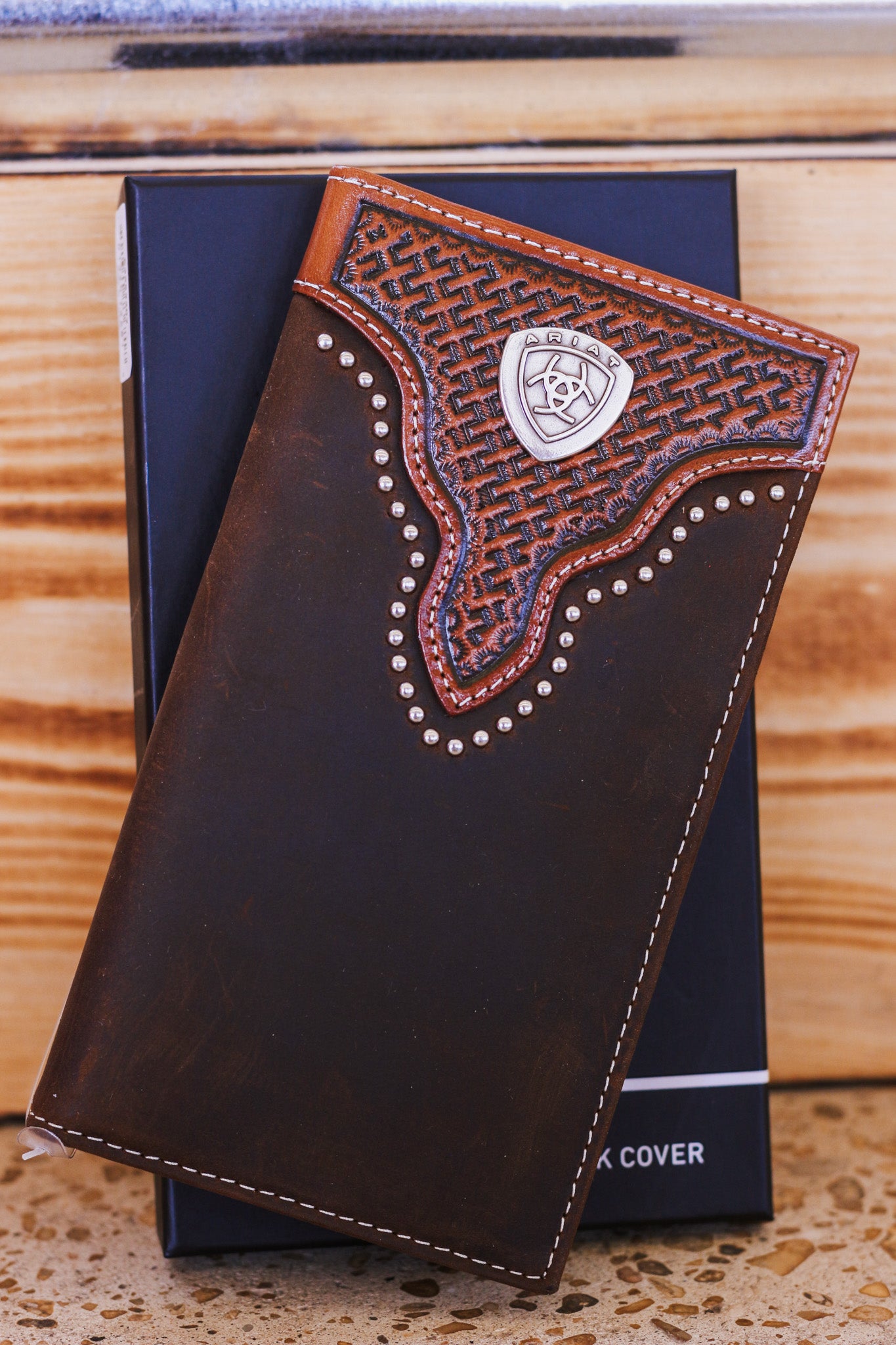 Ariat rodeo wallet by M&F Western Products. This great wallet is made of genuine leather with a basket weave and sunburst embossing and heavy duty stitching. Accented with metal stud trim and an Ariat logo concho in antique silver finish. Slim fit design. Credit card slots and one clear ID pocket for plenty of storage.