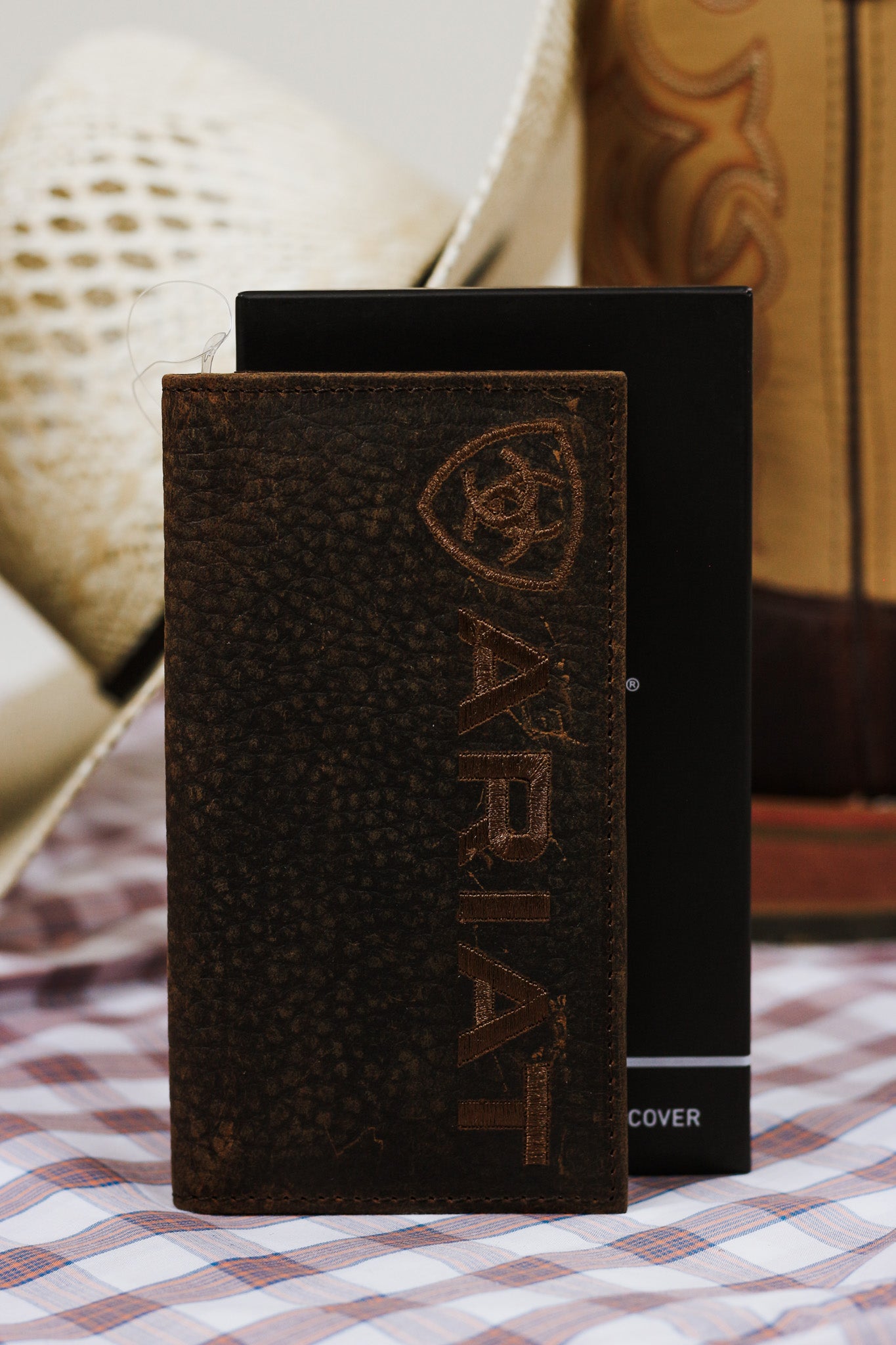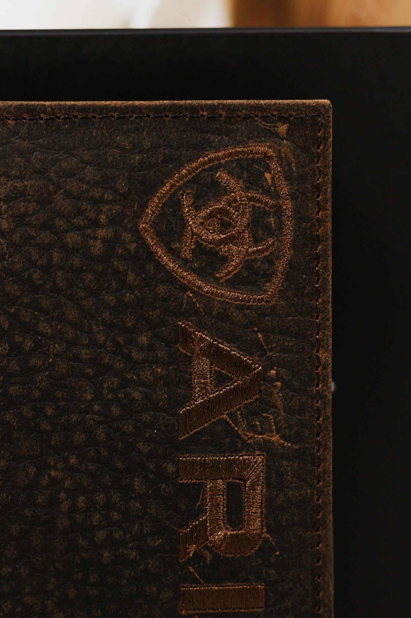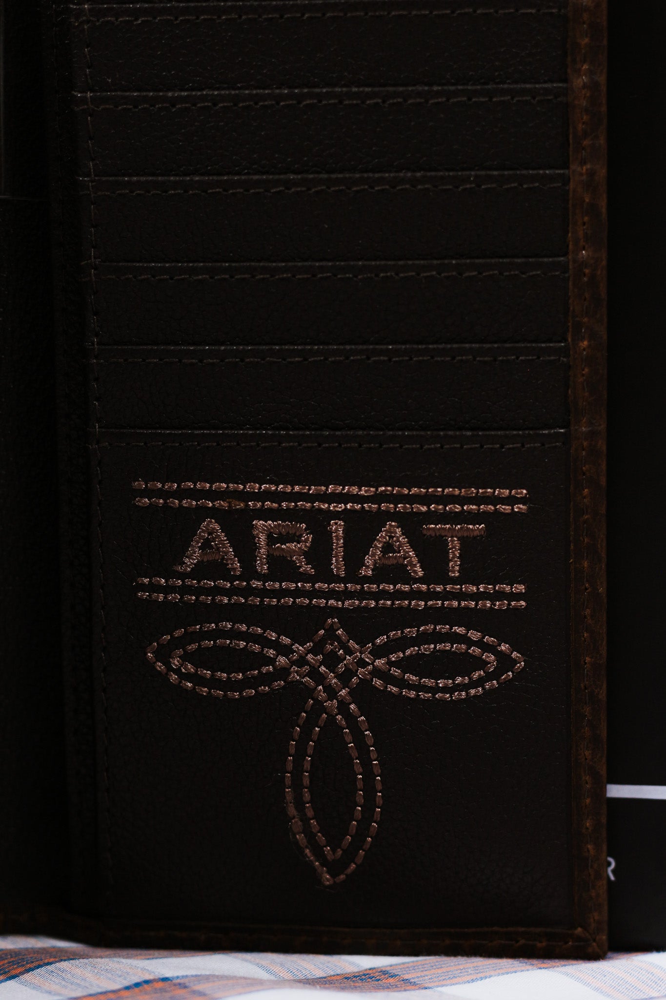 Ariat rodeo wallet by M&F Western Products. This great wallet is made of genuine brown bull hide leather with a brown Ariat name and logo embroidered along the side. Slim fit design. Heavy duty stitching with multiple card slots.