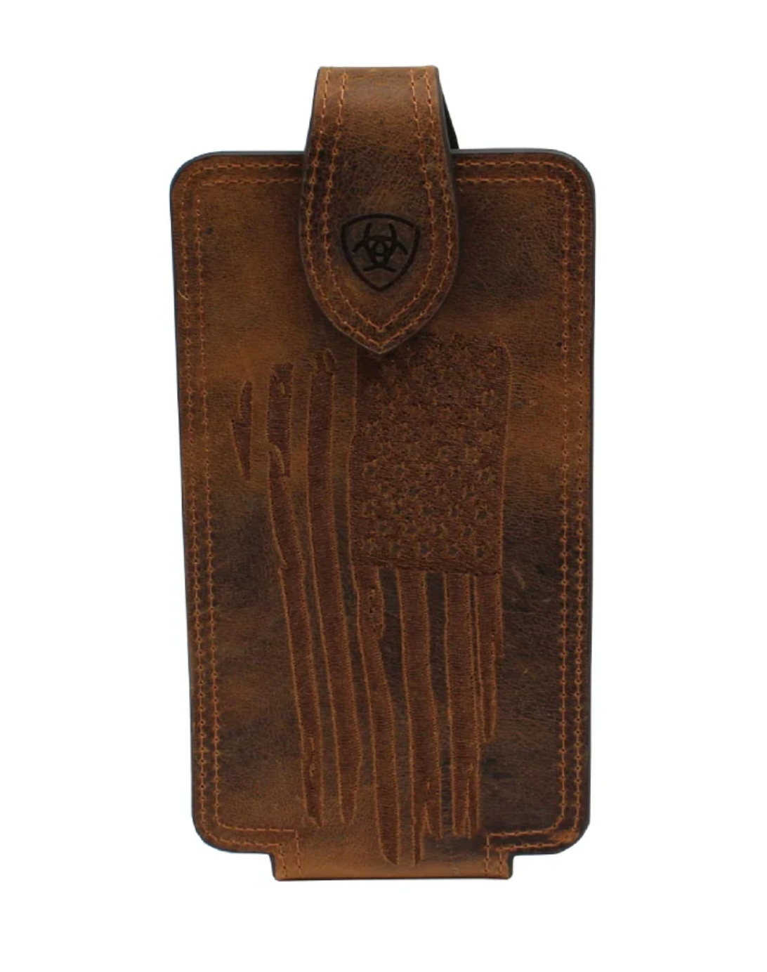 Unique Ariat Brown Cell Phone Case. Large Ariat cell phone case by M&F Western Products in genuine brown leather. Distressed USA flag stitched on front with Ariat shield logo on the flap. Plastic swivel clip on the back.
