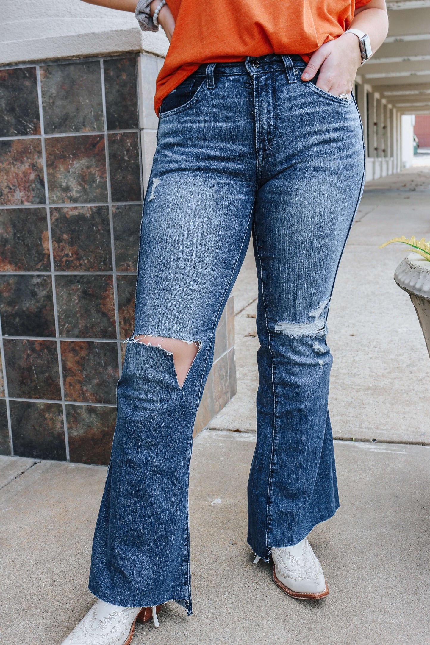 Slip into the Ariat R.E.A.L. High Rise Thea Flare Jeans and be the star of the show! These sleek and stylish women's jeans are perfect for any night out, with a mid-rise cut, ripped detailing, and a fun medium wash with dark wash accents. Turn heads and look your best in these flattering flares!