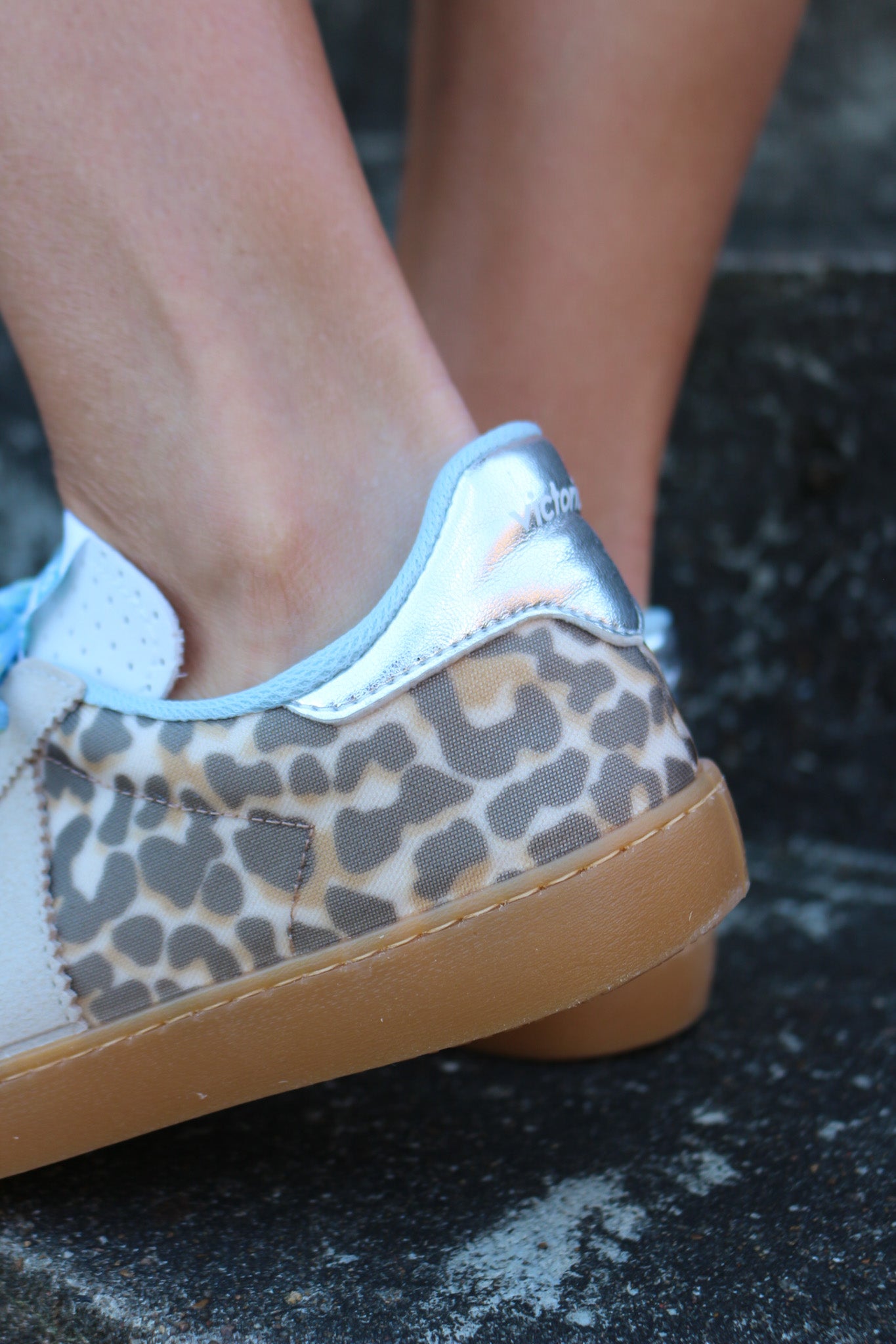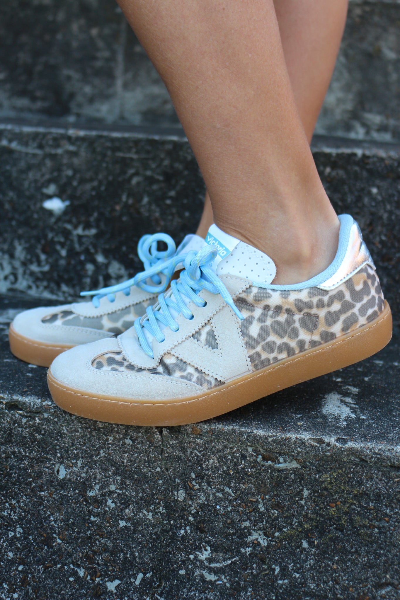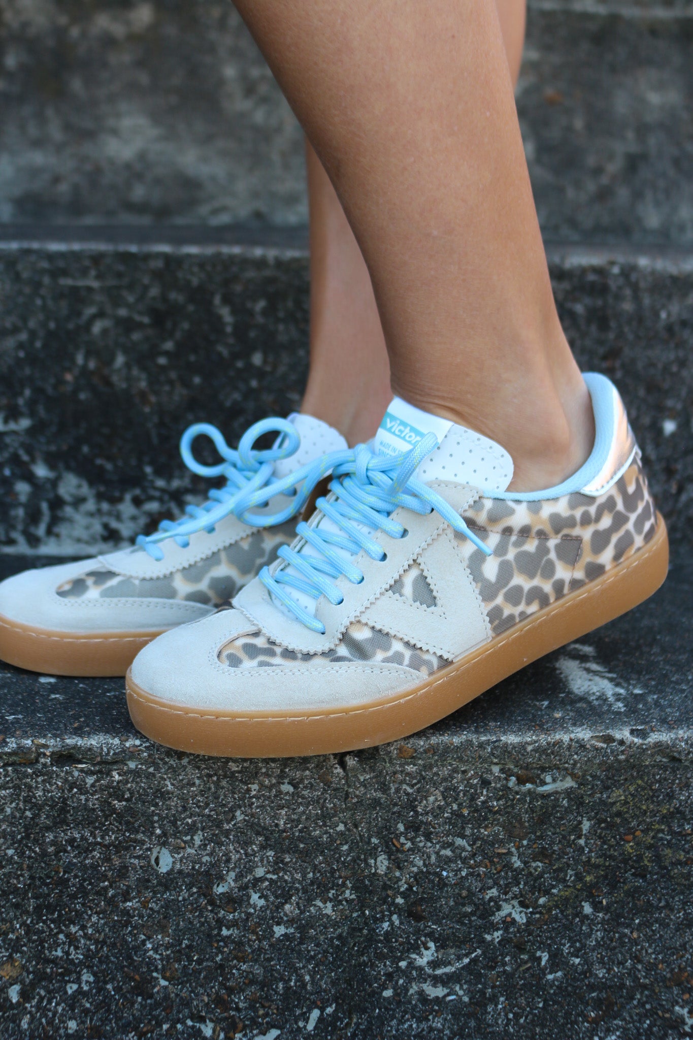 Animal print women's trainers made in Spain with matching suede overlay panels. Metallic heel panel. Round blue laces matching the inner lining and a perforated tongue. Translucent caramel colored T.R. sole.
