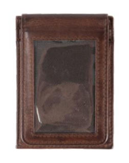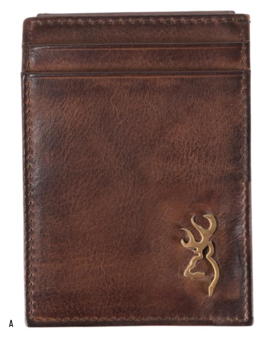This vertical folding wallet with magnetic money clip is durable and conveniently sized to easily fit into pockets. Features a brass "Buckmark" embellishment and a ID pocket.