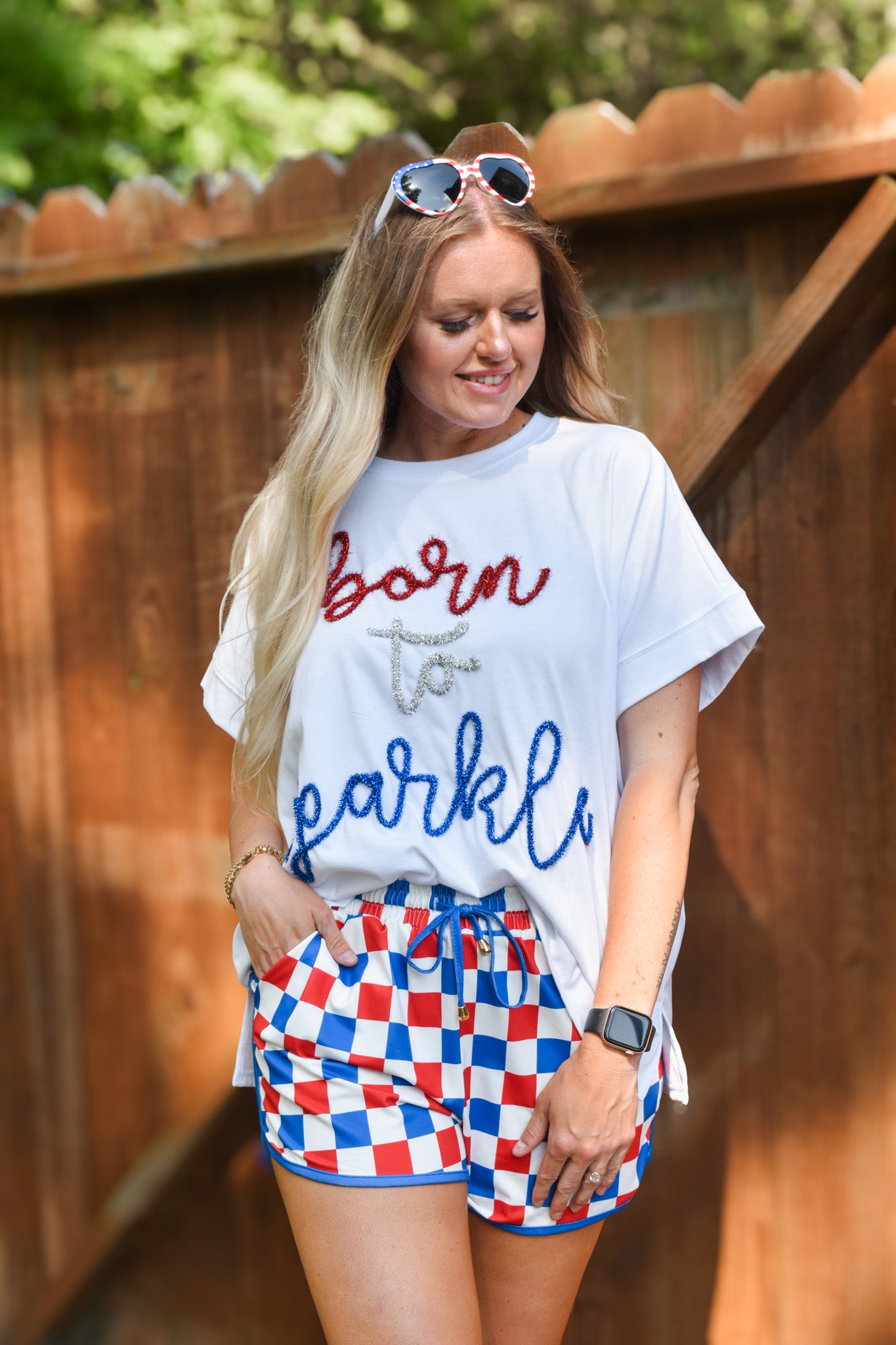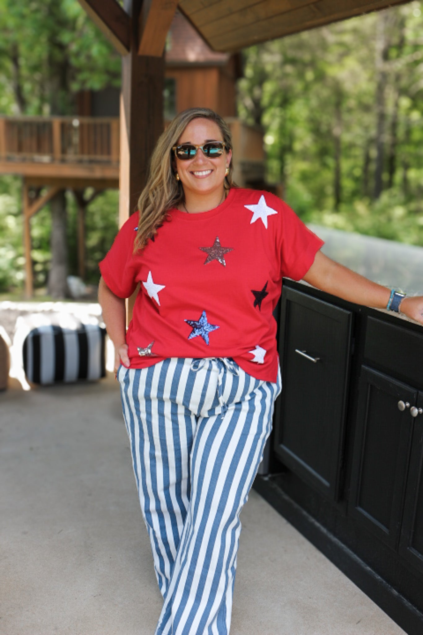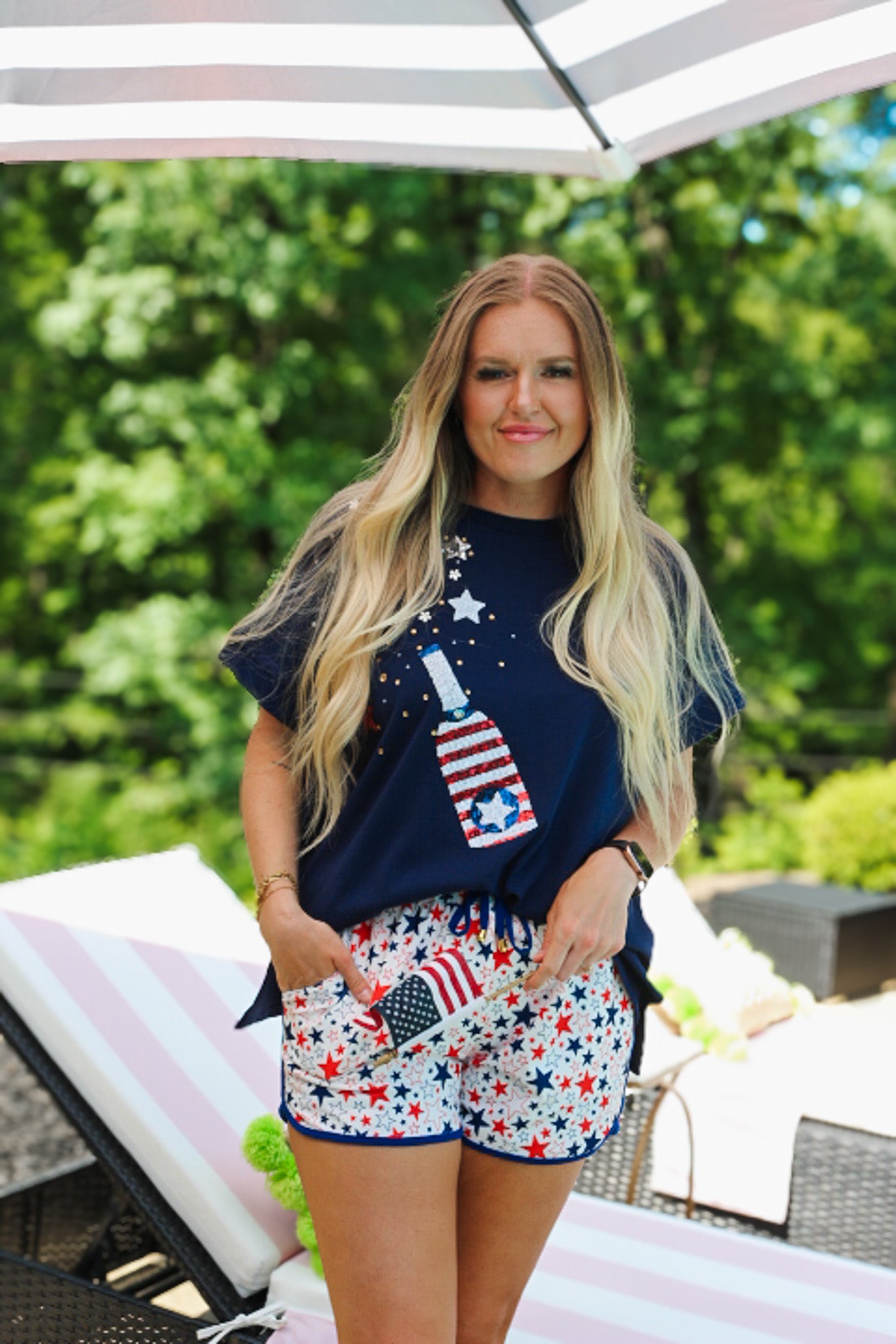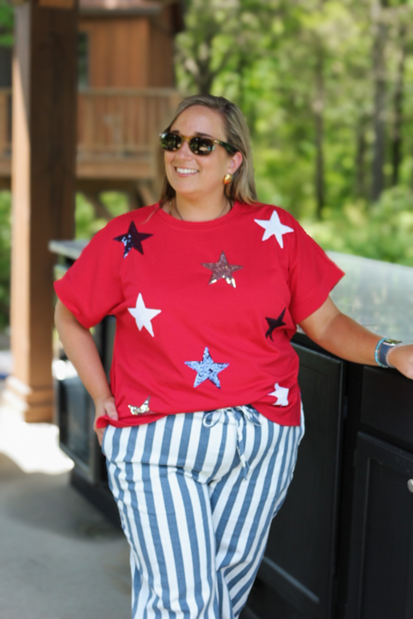 Add some sparkle to your wardrobe with our Celebrating July Sparkle Tops! Each shirt features a unique sparkle print in red, white, or blue. Perfect for patriotic events or any occasion that could use a little extra shine.