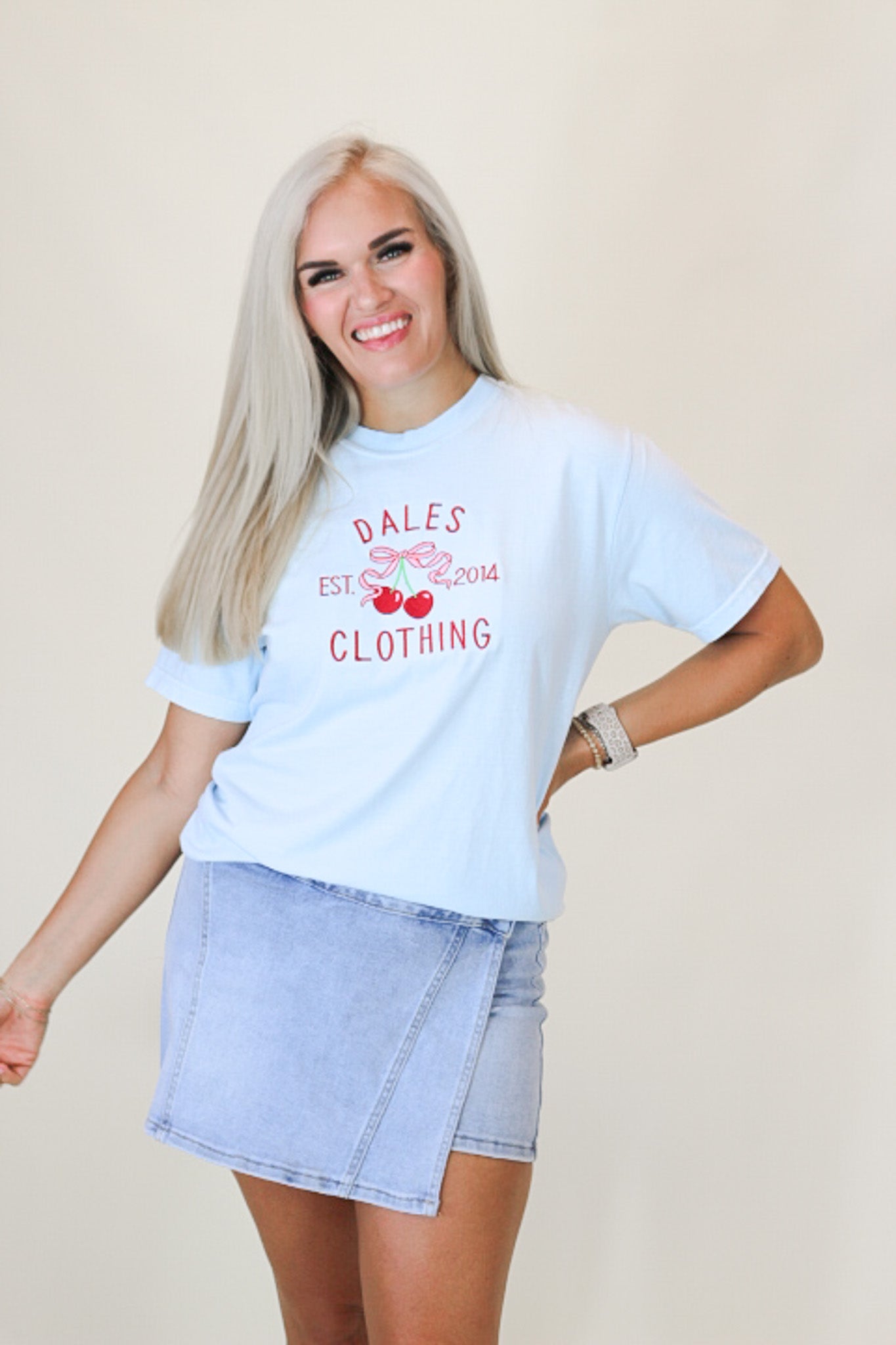 The Chambray Blue Cherry Dales Graphic Tee offers a comfortable fit with a stylish design that celebrates the spirit of Dales Clothing. Perfect for everyday wear, this tee supports your unique style with a relaxed, easygoing vibe.